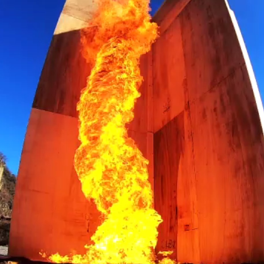激しく音をたてて燃焼する巨大な火災旋風が発生しました。その大きさは、ついたてを超えるおよそ6mになり、およそ1分間、燃え続けていました。