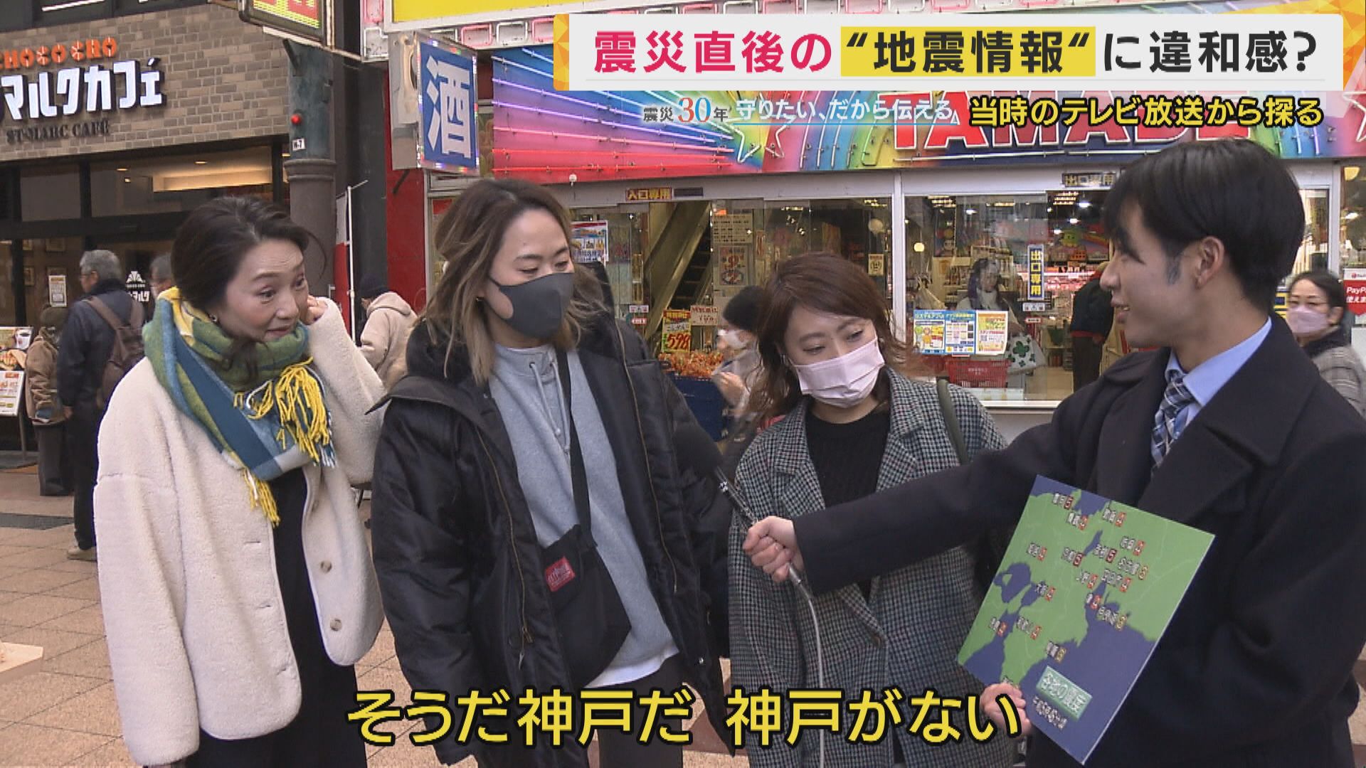 当時の震度図を街の人に見てもらい、「違和感」がないか聞くと、神戸市の震度が表示されていないことを指摘しました。
