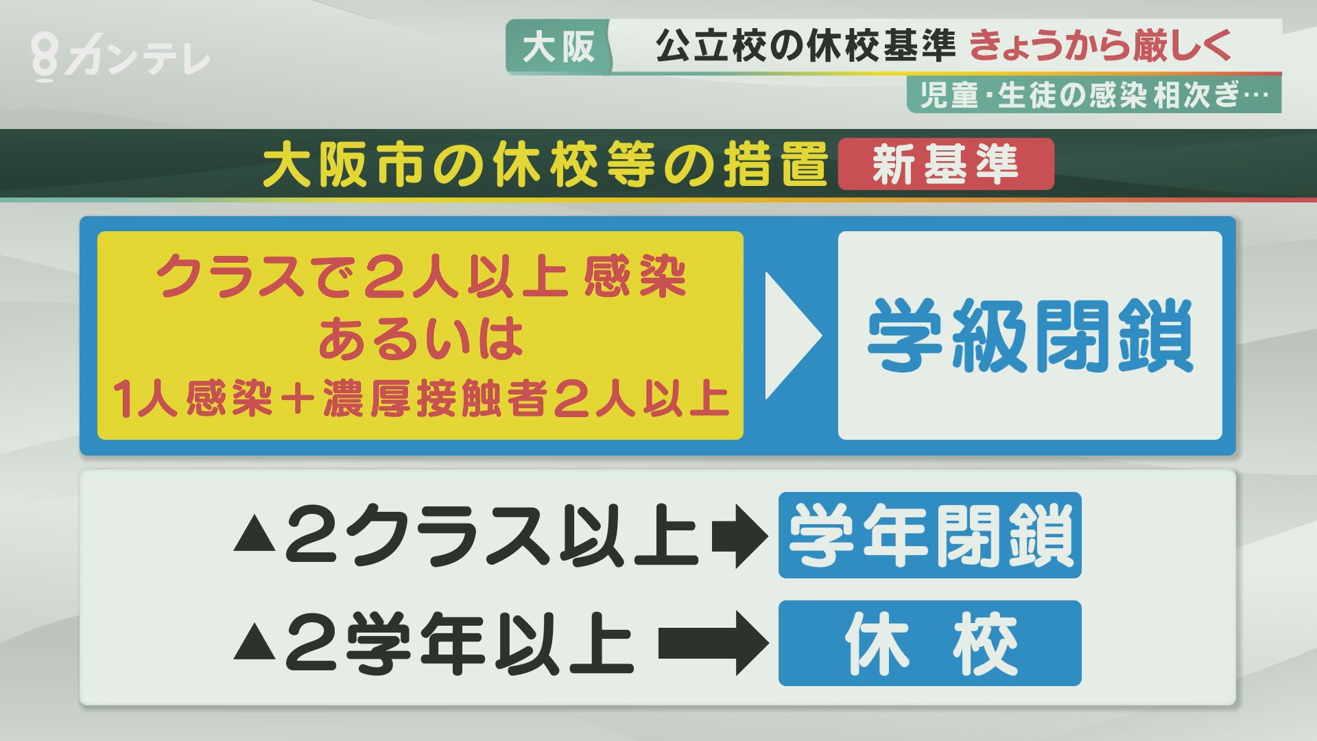 大阪市ではこれまでクラスの児童・生徒のうち2割ほどが感染したり濃厚接触者となったりした場合は、学級閉鎖をしていました。