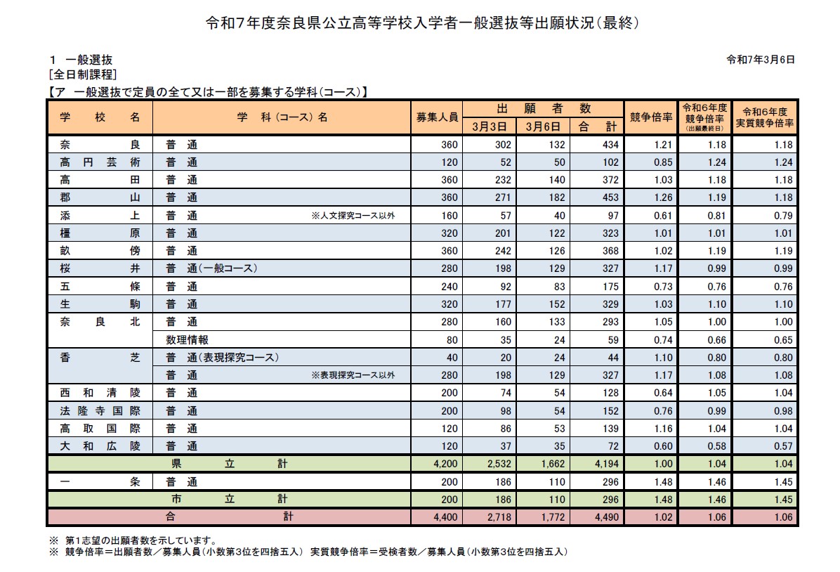 【全掲載】奈良公立高校入試 全日制一般選抜合計で競争倍率「1.02倍」 奈良高校は「1.21倍」 2025年03月07日