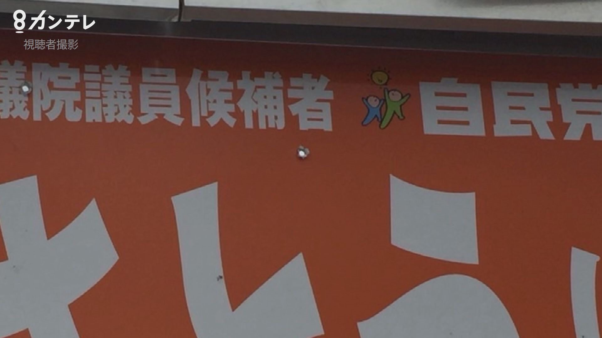 現場付近では複数の弾丸のようなものが見つかった。関西テレビが入手した写真には現場から約20mの場所にあった選挙カーにある看板を弾丸突き抜けたような痕があった。また現場から約90m離れた立体駐車場の、高さ約4mから8mの壁にも弾痕のようなものが3つ見つかった。