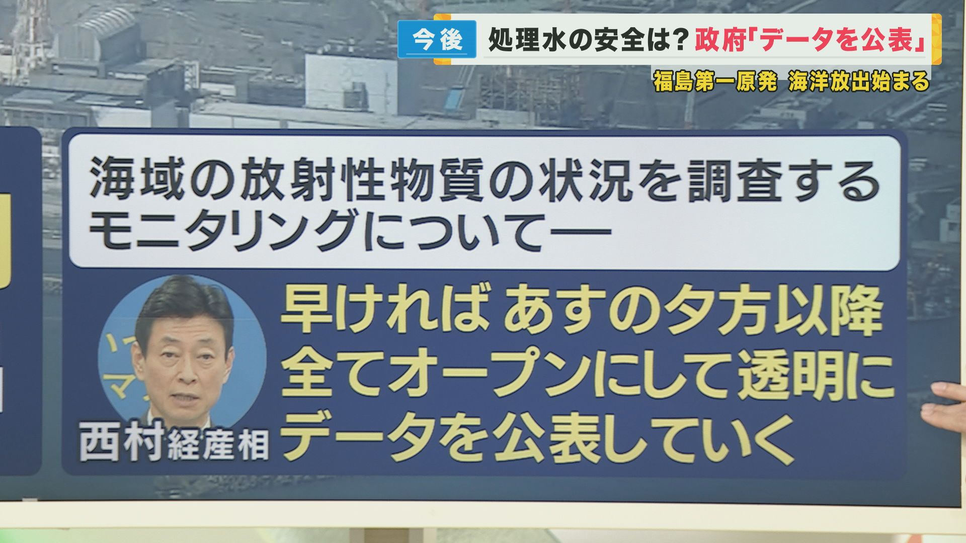 西村経済産業大臣は、海域の放射性物質の状況を調査するモニタリングデータについて、早ければ25日の夕方以降、全てオープンにして、透明にデータを公表していくとしています。