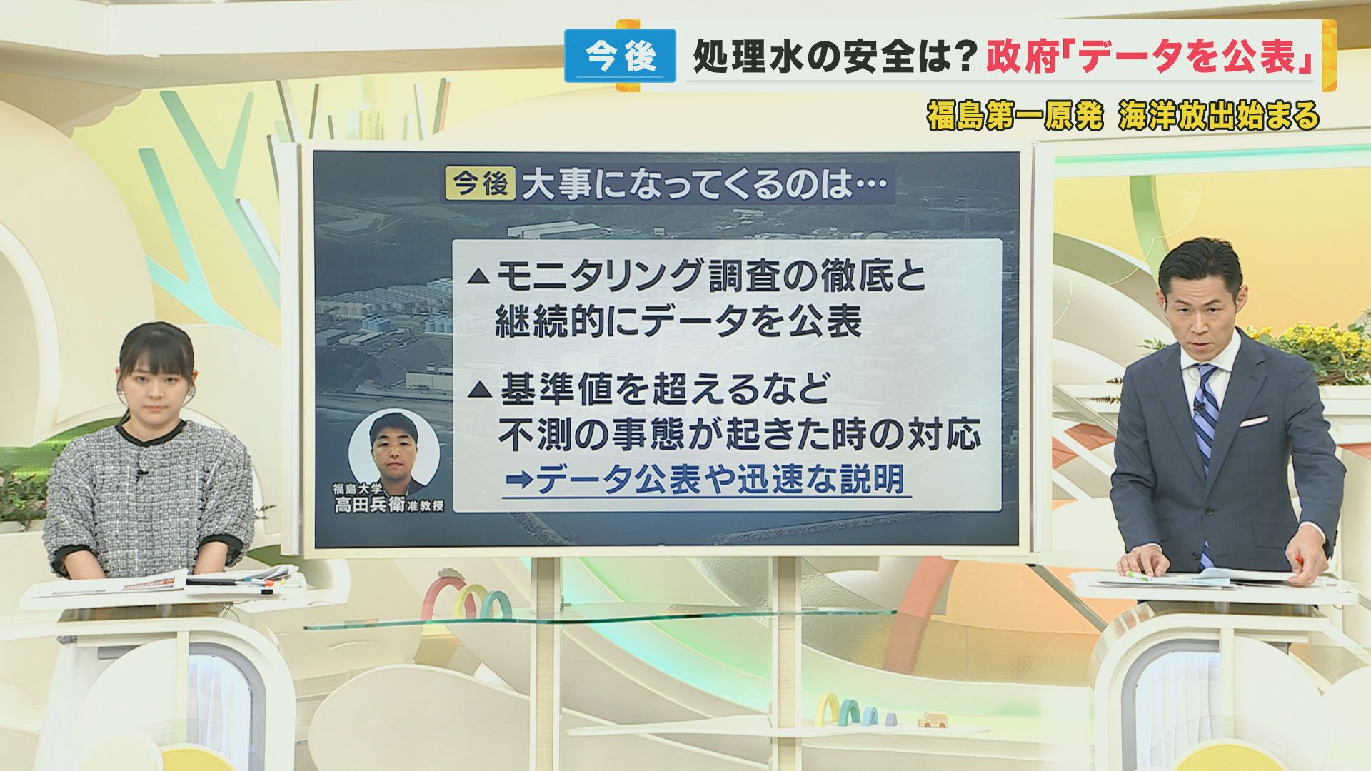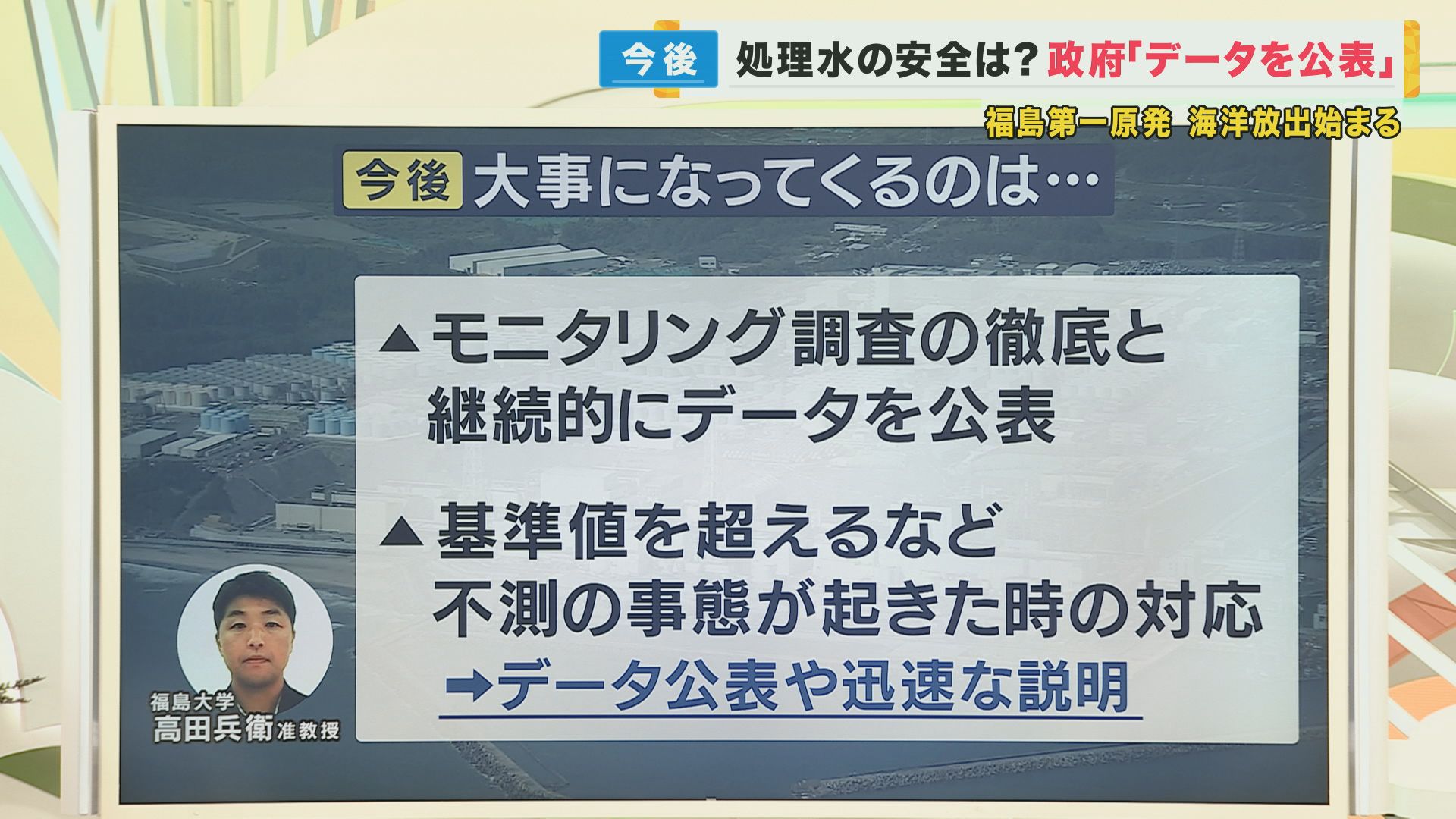 海洋放出には30年ほどの長い期間がかかるとされていますが、今後どういうことが大事になってくるのでしょうか。10年以上にわたって福島の海の放射性物質の変化について研究されている福島大学の高田兵衛准教授によると、「モニタリング調査の徹底と継続的なデータ公表」が大事だということです。さらに「基準値を超えるなど不測の事態が起きた時の対応 データ公表や迅速な説明」が求められると話しています。