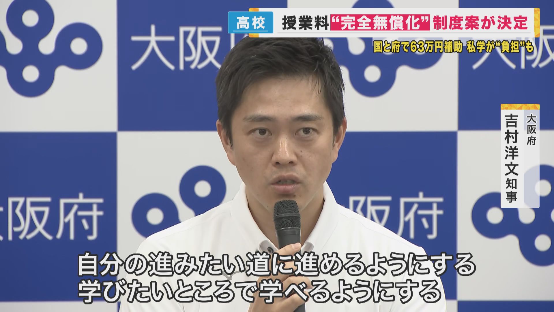 決定されたのは、公立・私立ともに府内の高校の授業料を無料にする「完全無償化」の新制度案です。これまであった所得制限を撤廃し、全ての生徒について63万円までの授業料を国と大阪府が補助、63万円を超える授業料は学校が全員分負担します。