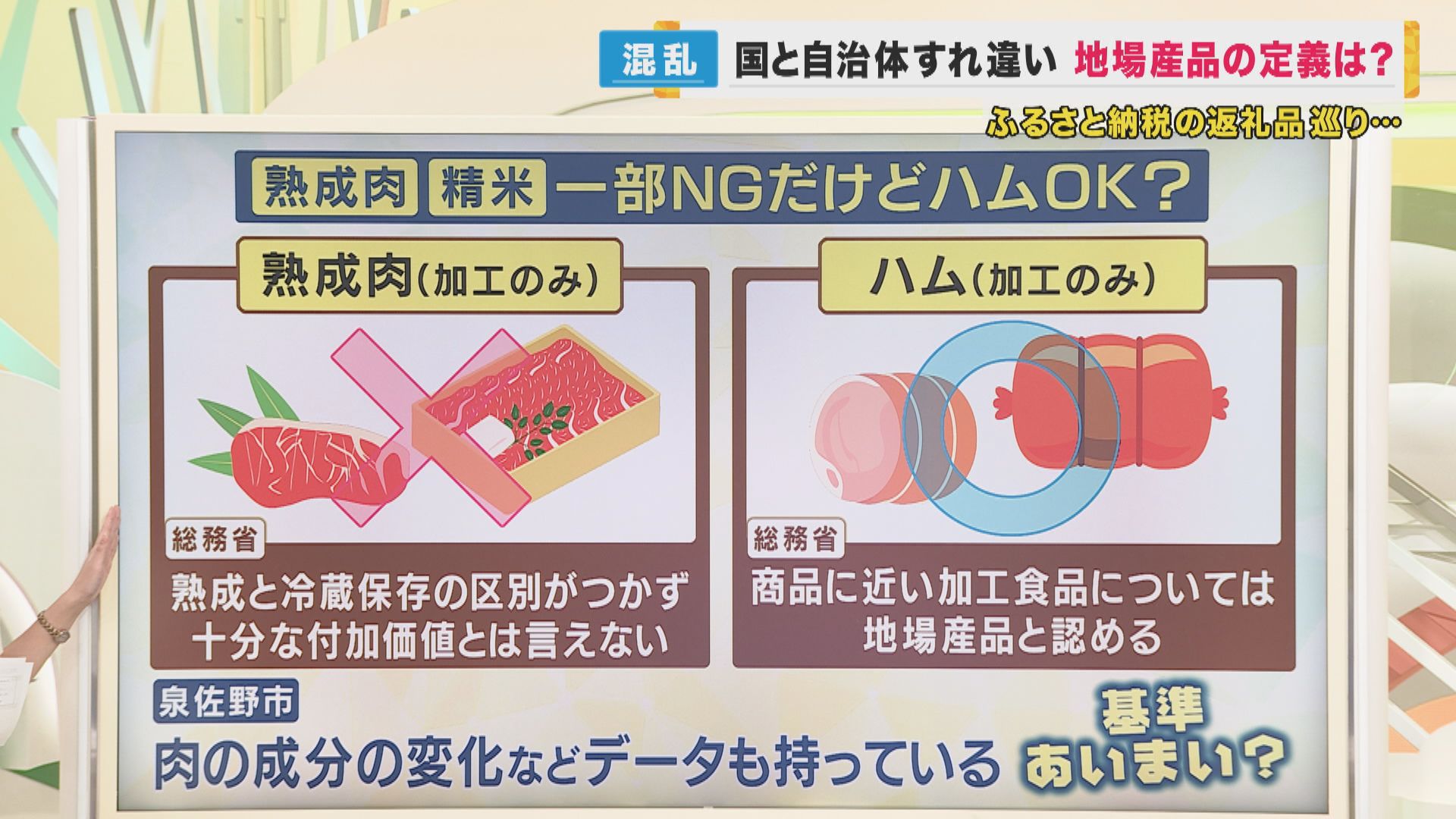 泉佐野市の返礼品としてNGとなった熟成肉ですが、これは何をもって“熟成”とするのかが曖昧で、冷凍保存との区別がつかないためNGとなりました。では「加工のみ」が行われたハムはどうなのか聞いてみると、「加工食品に近い商品だからOK」ということです。これに対して泉佐野市は「肉の成分の変化などデータも持っているから基準が曖昧なのでは?」と話しています。