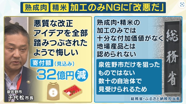 一方、総務省は今回のルール変更の理由として「熟成肉・精米の加工のみでは十分な付加価値がなく地場産品とは認められない」と説明しています。 また「泉佐野市だけを狙ったものではない。熟成肉・精米を広めているのは数十の自治体で見受けられるため、今回のルール変更に至った」としています。
