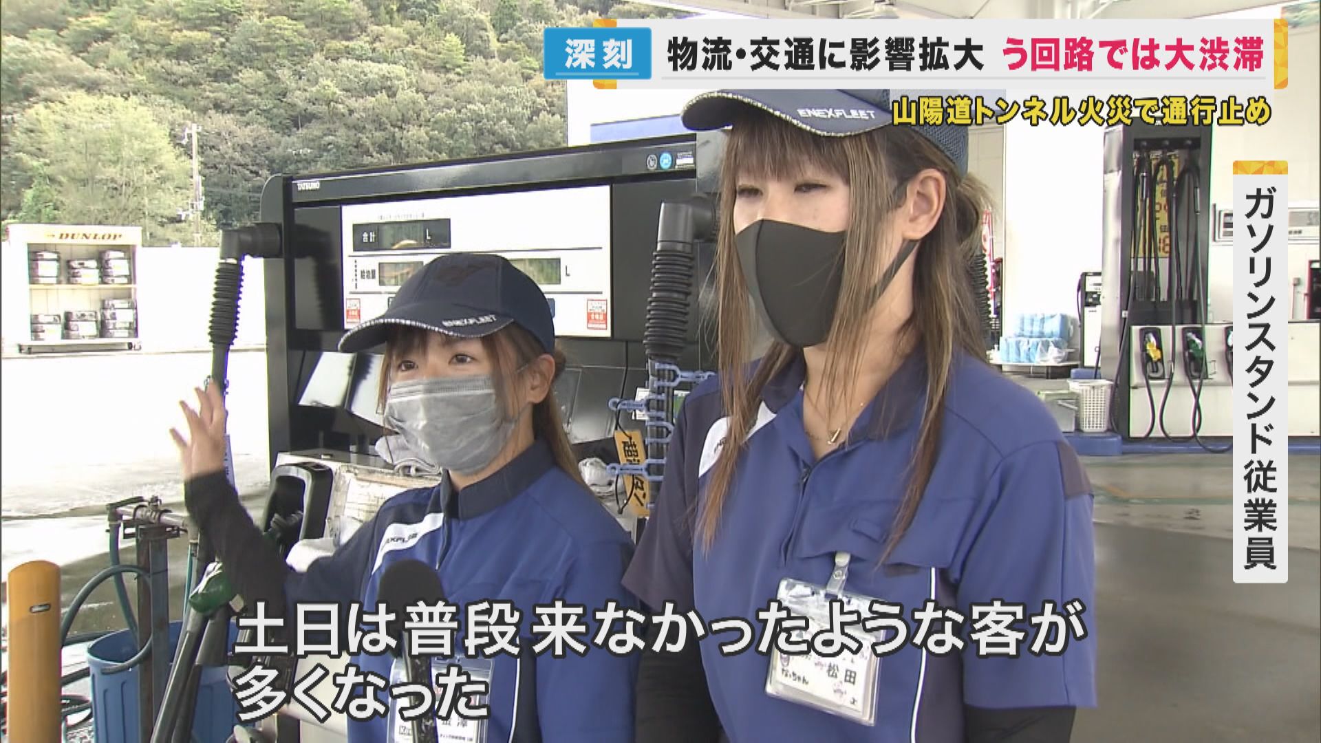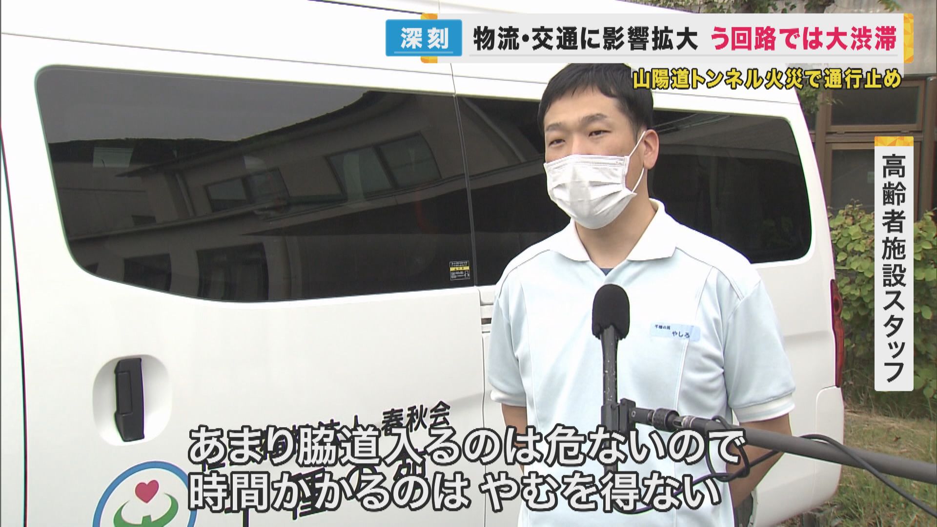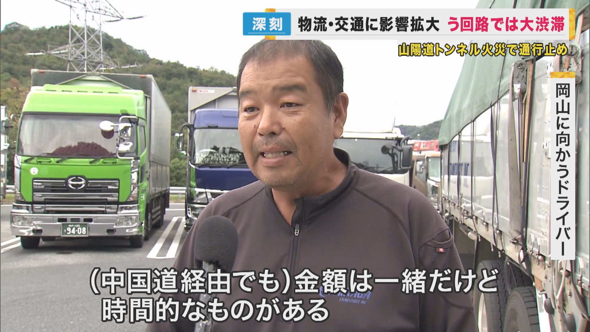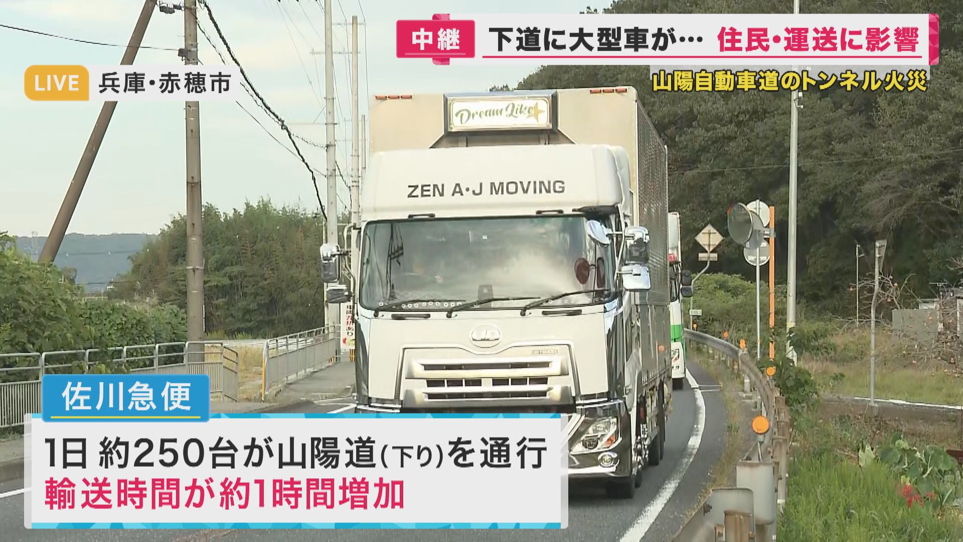 住民の生活以外でも様々な影響が出ています。運送業の佐川急便では一日に約250台が山陽自動車道の下り車線を通過しますが、迂回によって荷物の輸送時間が約1時間増加し、ドライバーの勤務時間も増えてしまっているということです。観光業界でも、高速バスを運営する神姫バスでは、神戸から広島に向かう便で約1時間ほど遅れているということです。