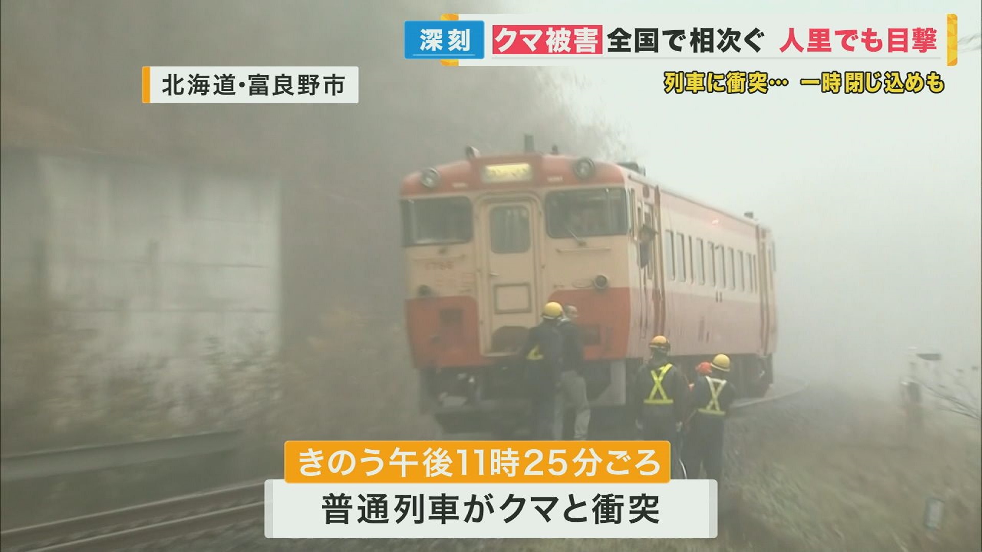10月30日、午後11時25分頃には、富良野行きの1両編成の普通列車がクマと衝突しました。クマの生死がわからず、乗客5人は夜が明けて、クマが死んでいるのが確認されるまで、約7時間にわたり車内で過ごしました。