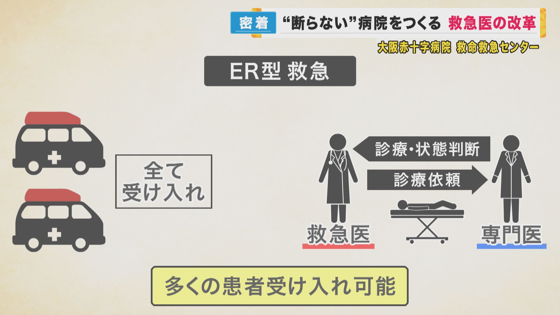 水医師がここで実現を目指すのは、“ER型救急”と呼ばれる形です。これまで日本で一般的だった救急は、命の危険があるような重症患者を受け入れ、救急医が診断を下し、処置から集中治療まで全てを行うものでした。