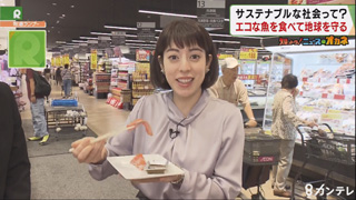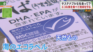 『サステナブルシーフード』とは、海の資源が枯渇しないように産卵前の魚や稚魚をとならないなど、適切に管理して獲られた水産物の事。目印は“海のエコラベル”と呼ばれるこの青いマークで天然ものと養殖の2種類あり、イオンでは鮮魚・加工品など合わせて64種類を展開しています。