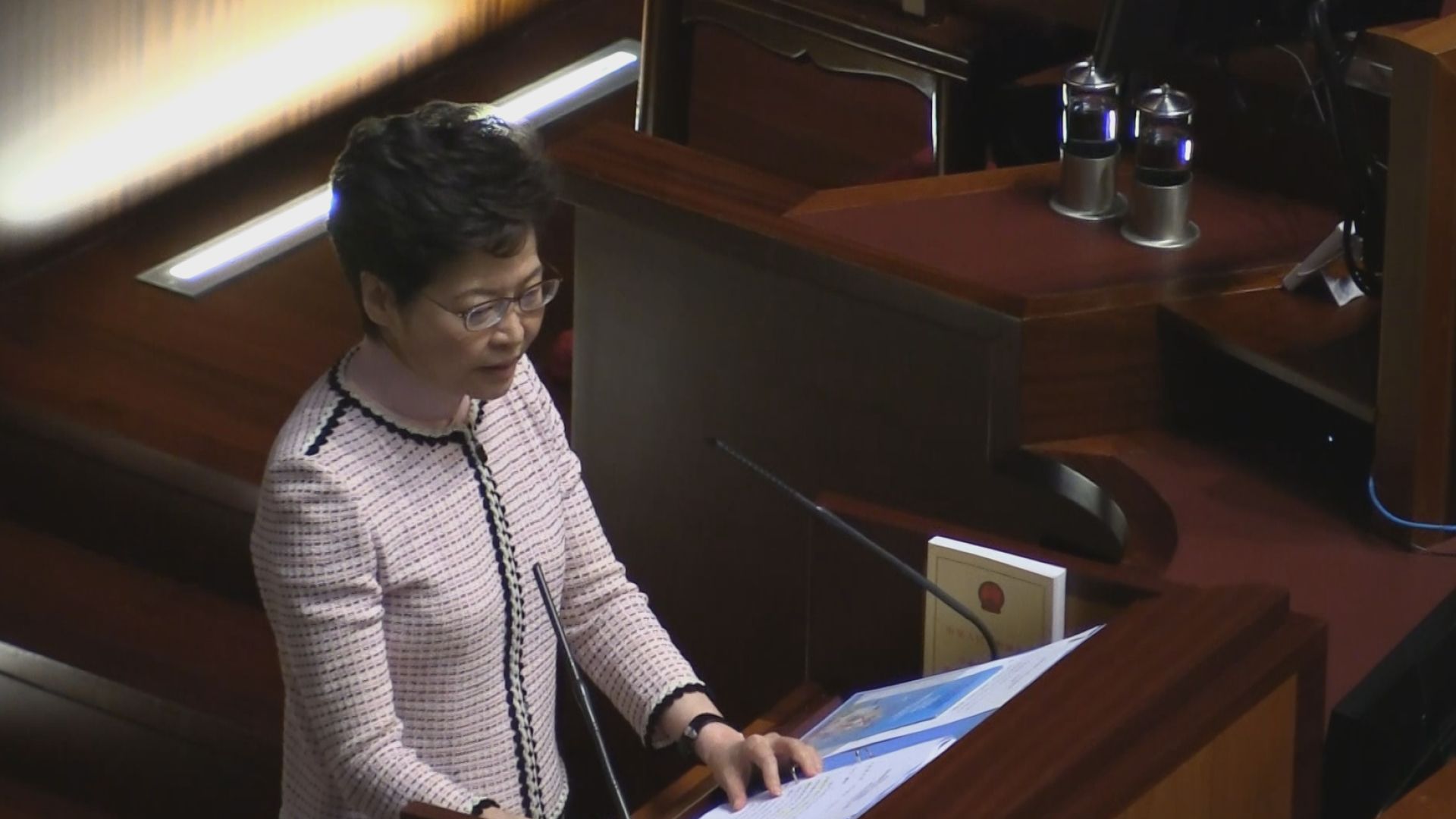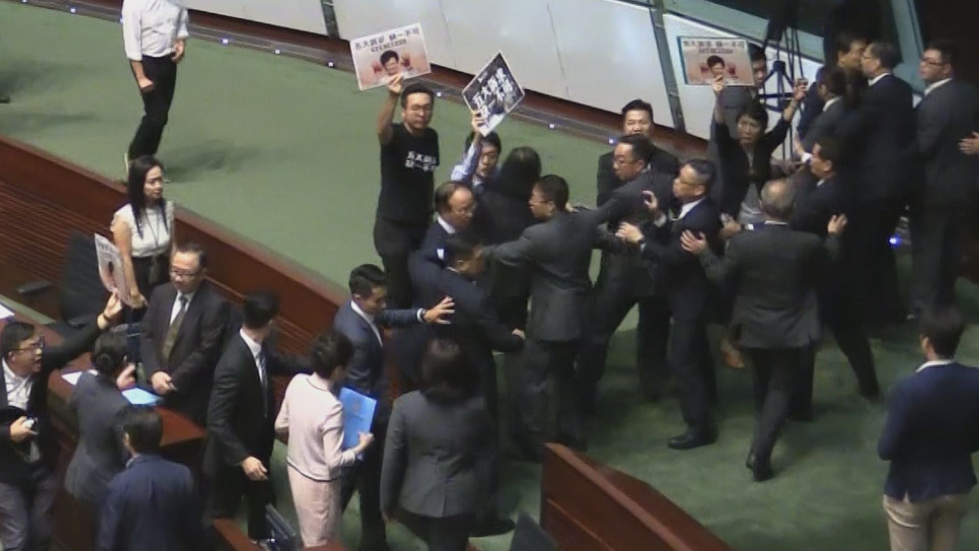 新会期の香港議会は大混乱。施政方針演説をする林鄭月娥行政長官の声を遮り民主派議員が抗議し詰め寄る。プラカードを掲げ中国の習近平国家主席のお面を被り、さらに投影機で議場の壁に「五大要求一つも譲らない」とデモ隊のスローガンを映す。
