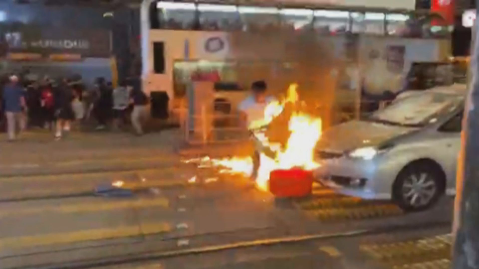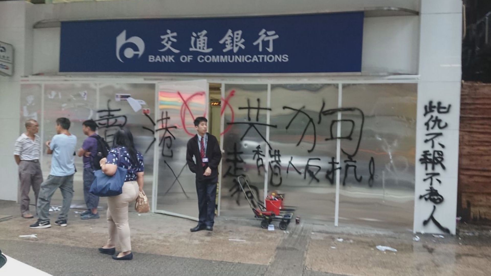 中国に関係する施設も相次いで攻撃され、中国系銀行の支店やATM機、携帯電話メーカーの店も放火された。町の小さなマージャン店やゲームセンターまで破壊された(この店が親中国かどうかは不明)。「デモ隊を支持します」と張り紙する店もある。デモ隊は様々な店などを色分けして発信する。青は政府支持、黄色はデモ支持とリストが作られ、青なら抗議活動のターゲットになる。