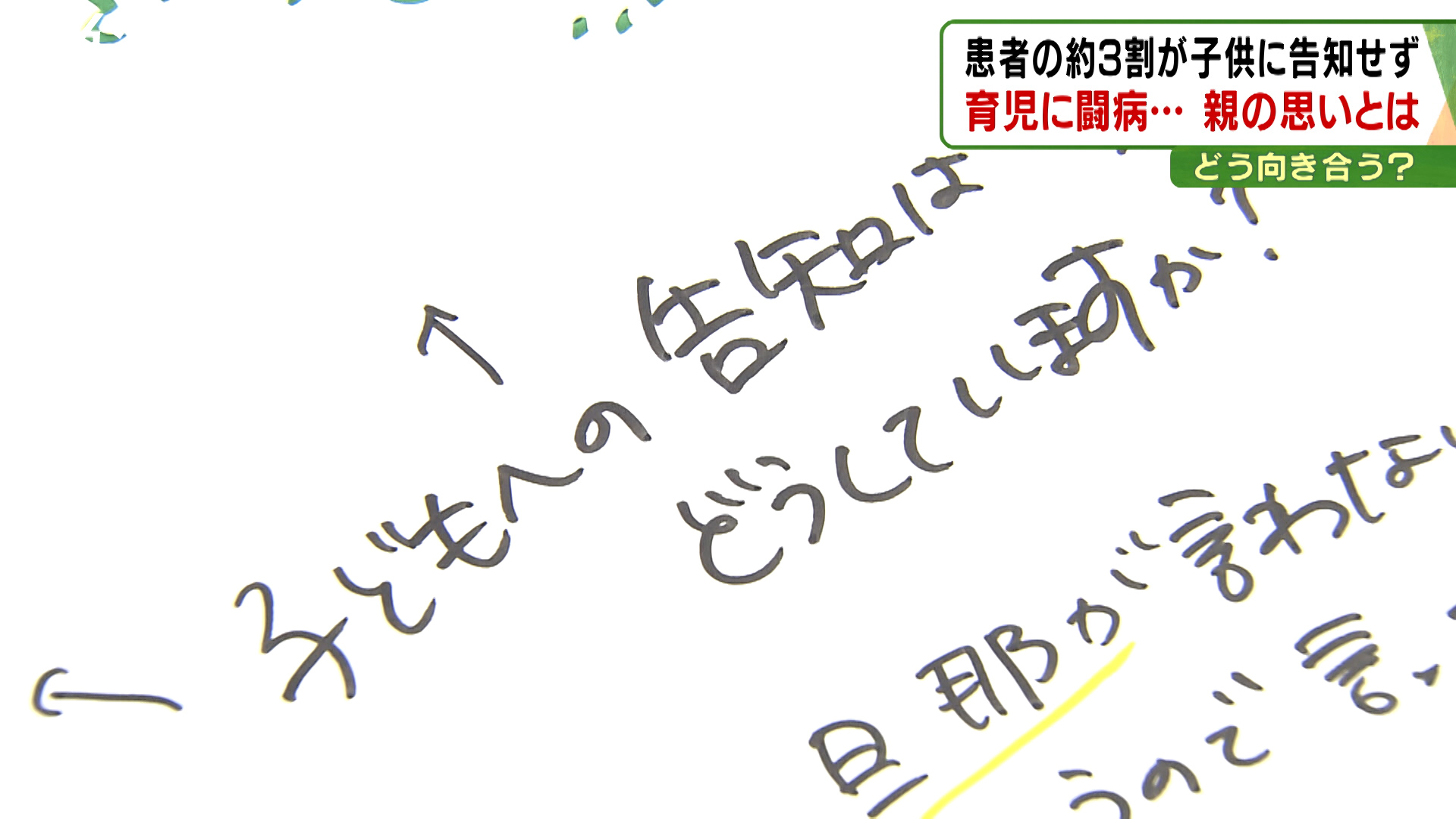 「これだよっていうのはいっていない。旦那がそれは言わないでほしいと。どっちかというと悪いイメージしかないから名前だけがひっかかるって旦那がいうので。長男はがんじゃないかっていうのは思っているけど、なにかとはわかっていないし私もきかれたら違うよって。ただずっとこのままでいいのかとかすごい悩むんですよね」