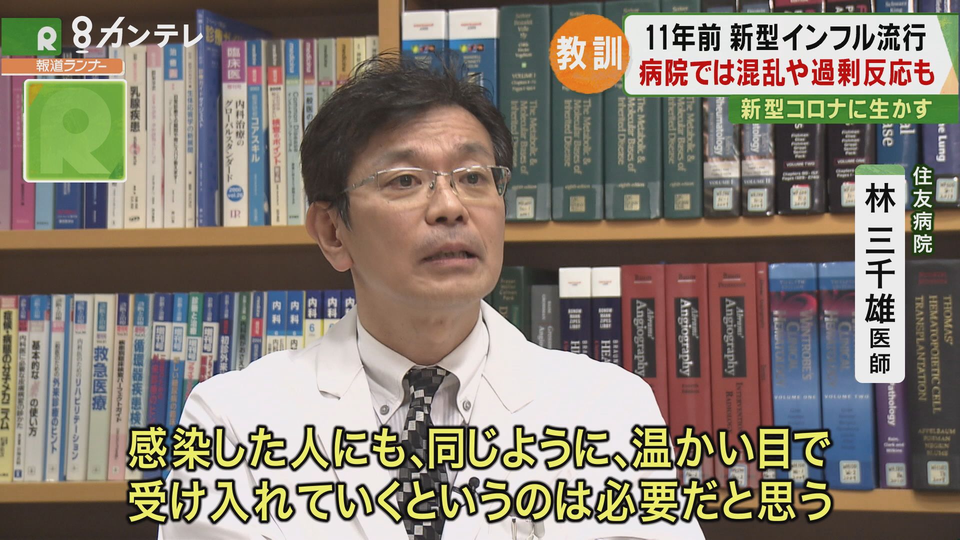 「新型インフルのときはヒステリックな感じになったが、あの当時の新型インフルエンザは季節性インフルエンザになって、いま普通にみんなかかってる。今思えば、その当時ヒステリックな対応して怖がったのが、今になればおかしかったと思える。自分にもうつっていくかもしれない。感染した人にも、同じように、温かい目で、受け入れていくというのは必要だと思う」