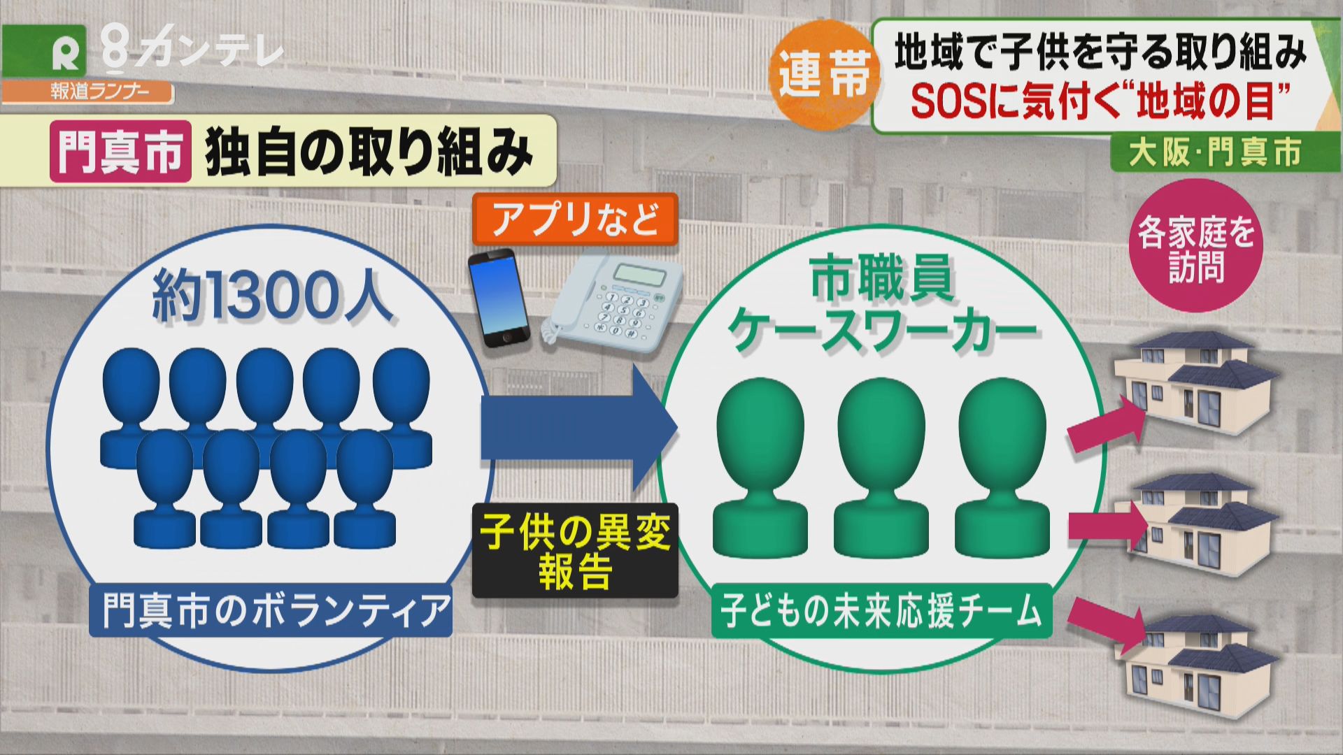 門真市ではまず、約1300人のボランティアが「服装が季節外れ」「十分に食事をしていない」など、子どもに関して気付いた情報を、市の職員などで構成された「子どもの未来応援チーム」に報告します。