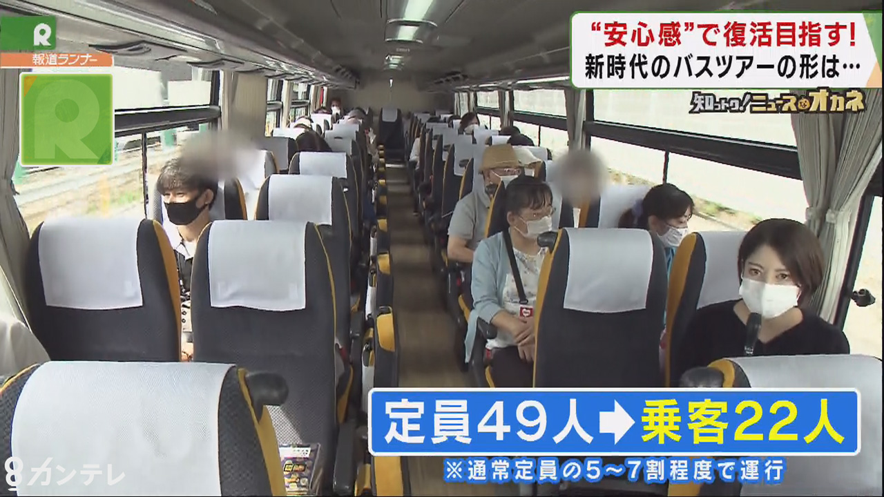 「皆さん、バスに乗り込む前に、手を消毒してから中に入っています。こちらの観光バス。定員49人に対して22人の方が乗車されています。乗客数を抑えて車内の密度を低くする工夫をされています」
