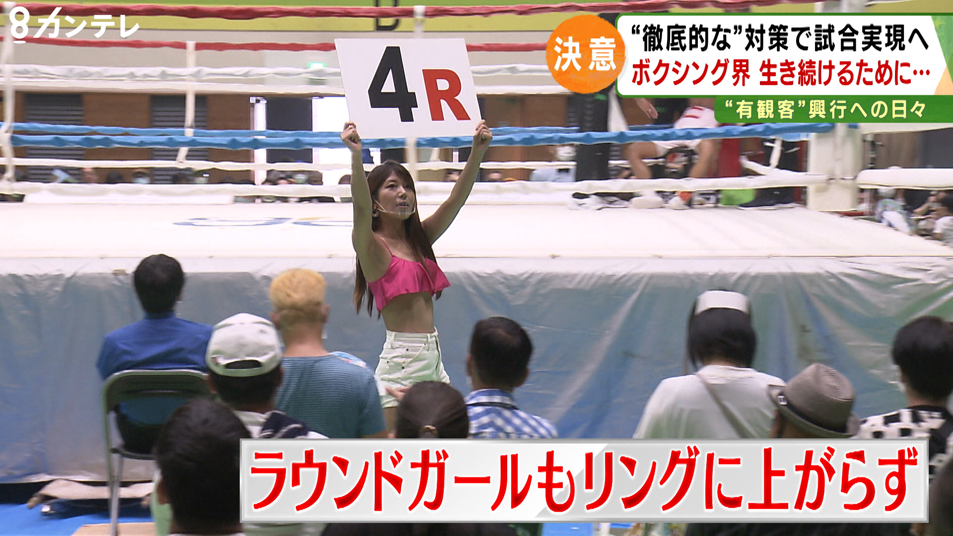 通常はリングに上がるラウンドガールも、マウスシールドを着け、リングの周りをまわるだけにしました。