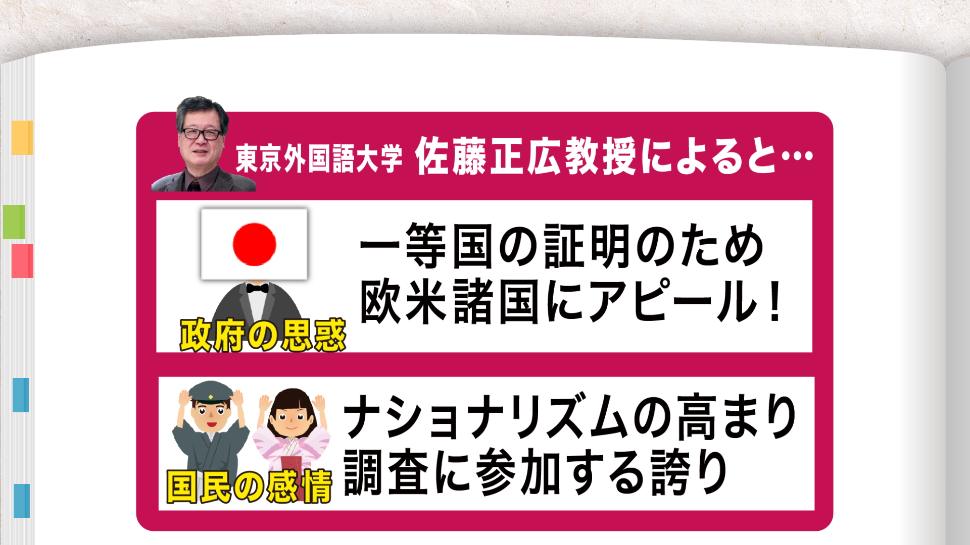 合言葉は「文明国の仲間入り」だった。時代背景について、東京外国語大学の佐藤正広教授にに伺うと、政府の思惑は…「一等国の証明のため欧米諸国にアピール」国民の感情は…「ナショナリズムの高まりと、調査に参加する誇り」とのこと。