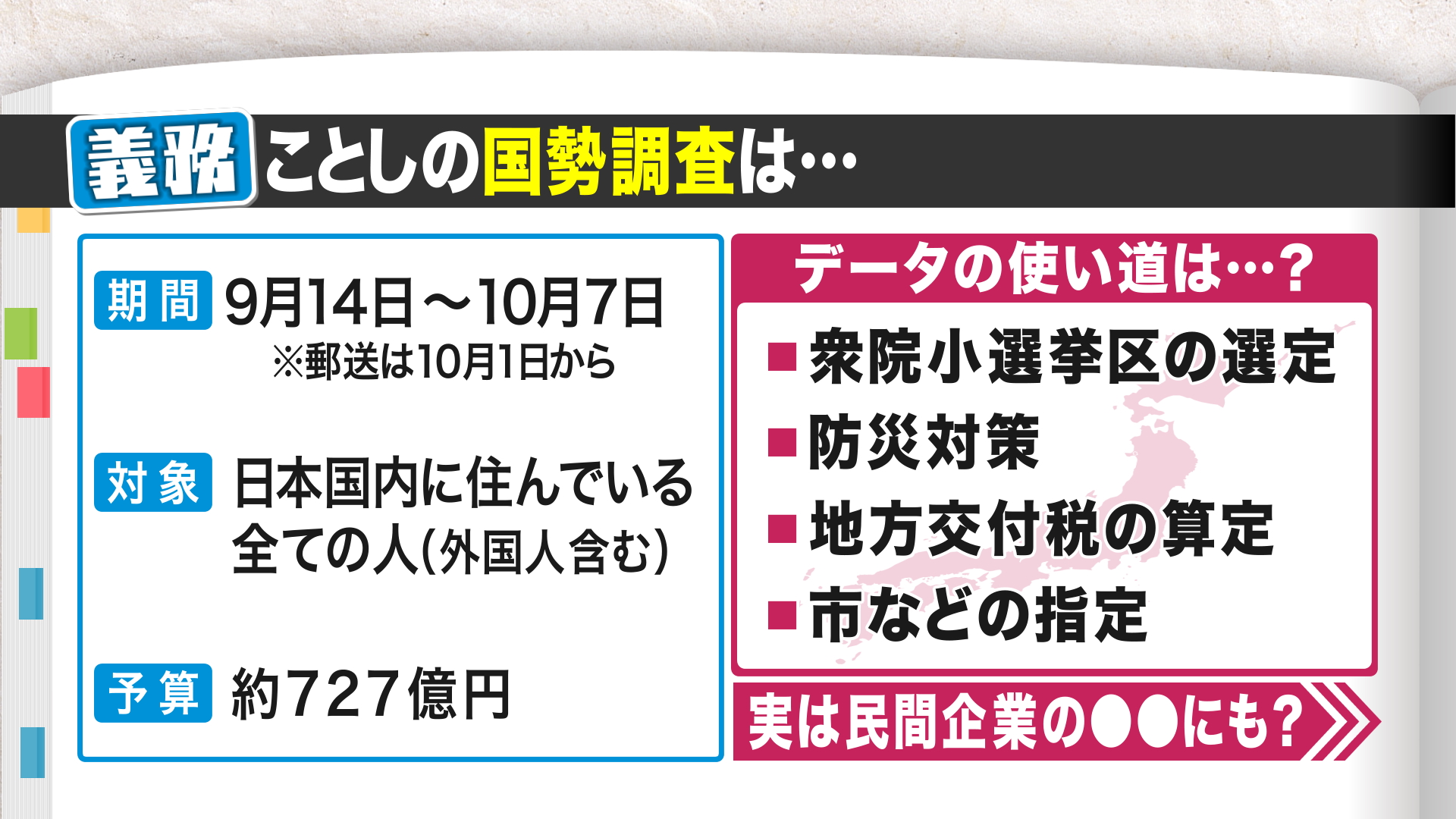 今年の国勢調査は日本国内に住んでいる全ての人を対象(外国人含む)にしていて、予算は約727億円。10月7日までに回答する義務があります。