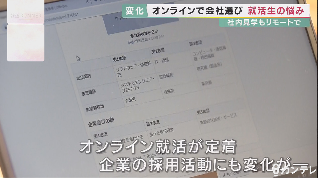 新型コロナウイルスの影響で、オンラインでの就職活動が定着しているのですが、就活中の大学生を取材すると、仕事選びに大きな変化が起きていました。