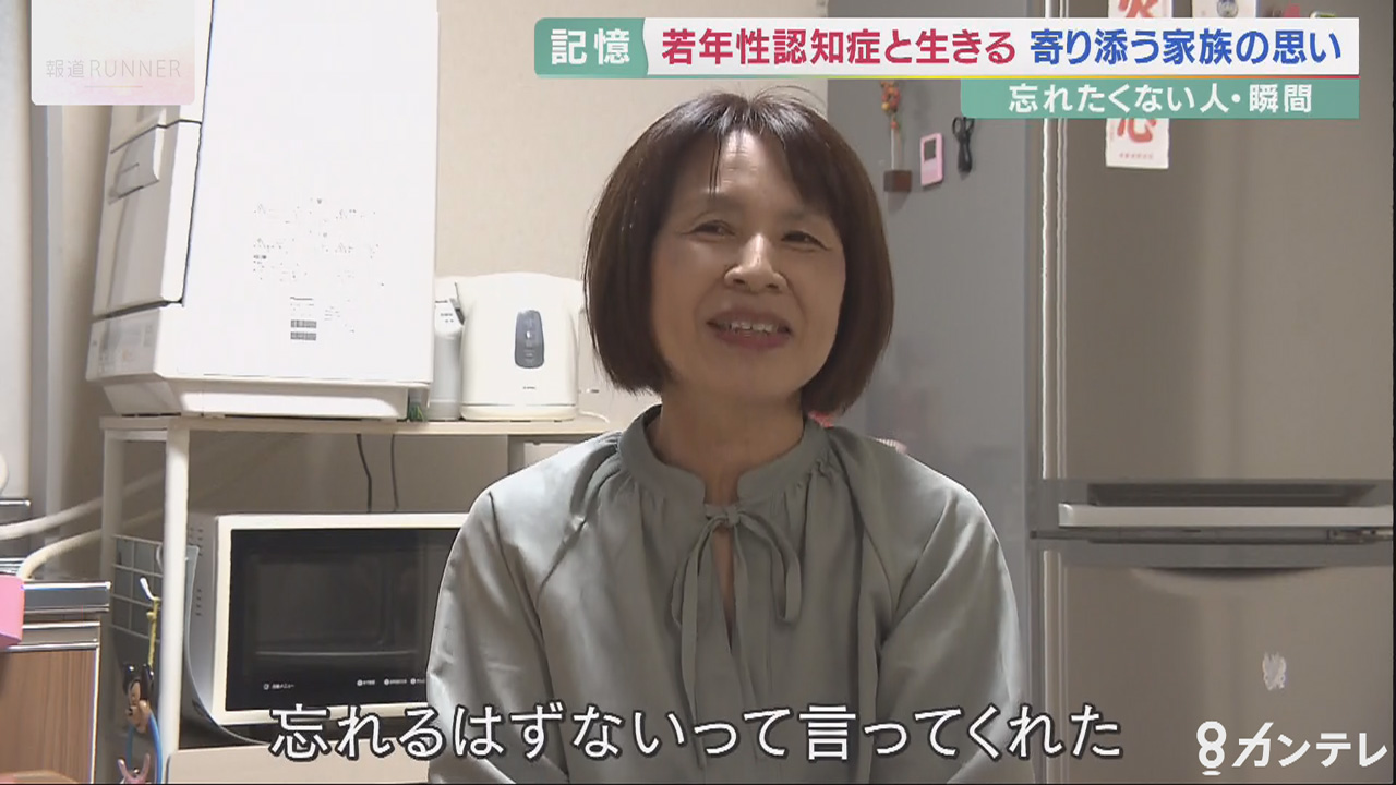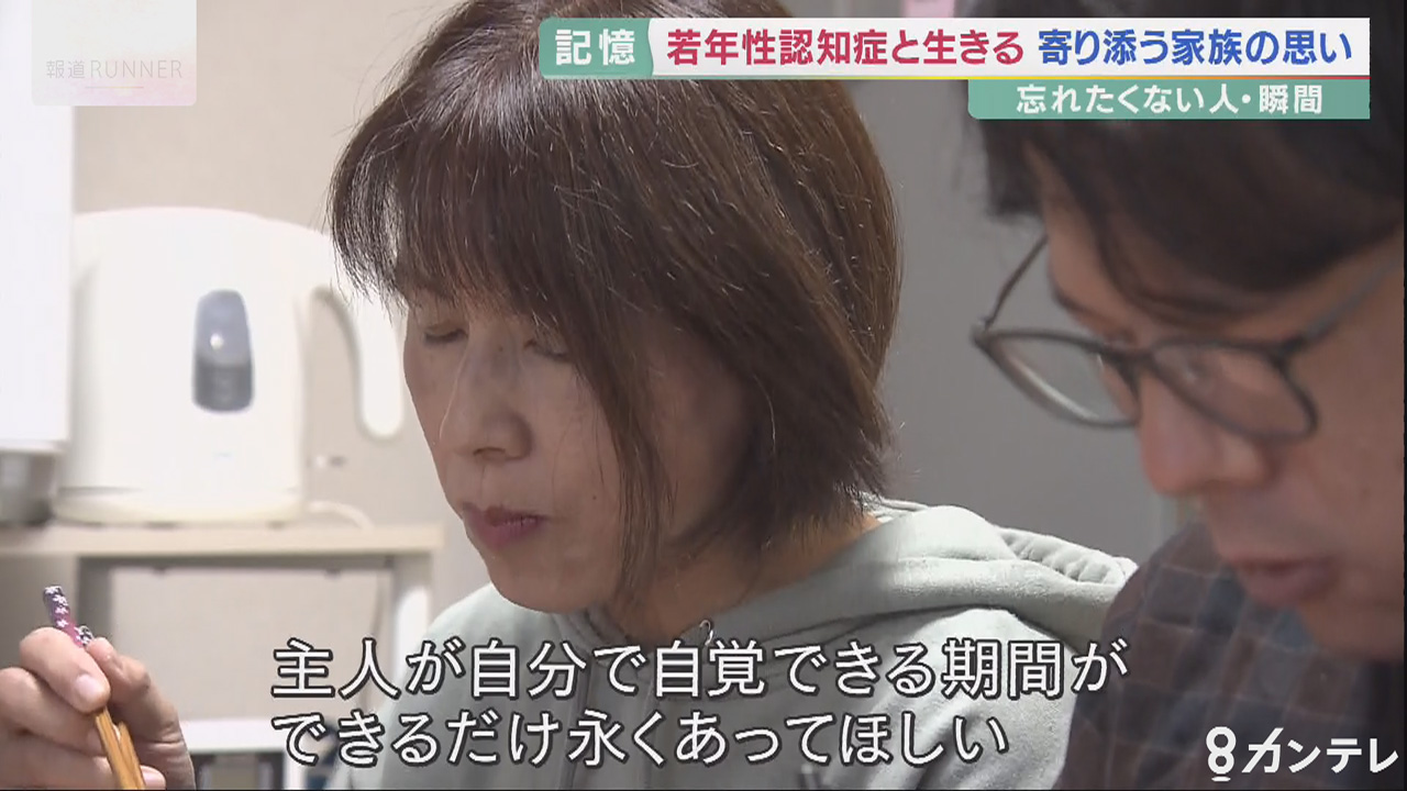 「どっかで、なんかウソでありたいなっていうのを今でもどこかで信じてるってのがあるから、実際、主人も進行を感じてるっていう言葉を本人の口からきくと、ああそうやんなあって、現実なんやって、進行ができるだけゆっくりであってほしい。主人が自分で自覚できるっていう期間ができるだけ長くあってほしい」