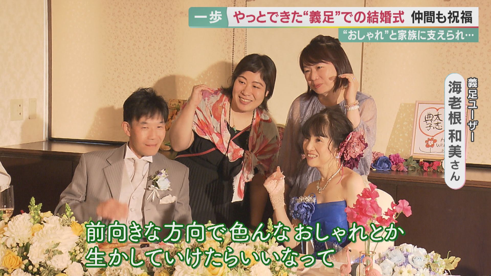 自慢の義足とドレスで臨んだ披露宴では、海老根さんたちハイヒールフラミンゴのメンバーも祝福しました。