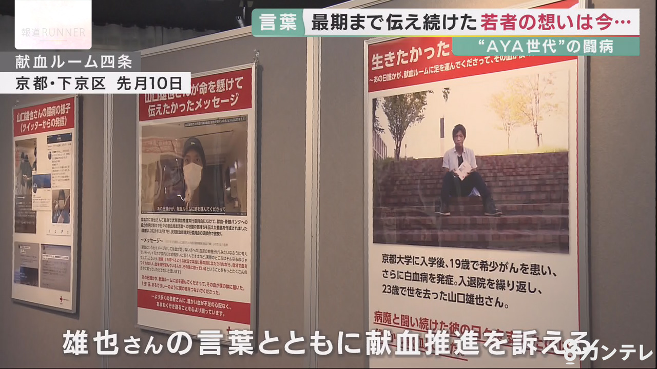 2月、京都市の献血ルームには、雄也さんの言葉とともに献血推進を訴えるパネルが展示されました。