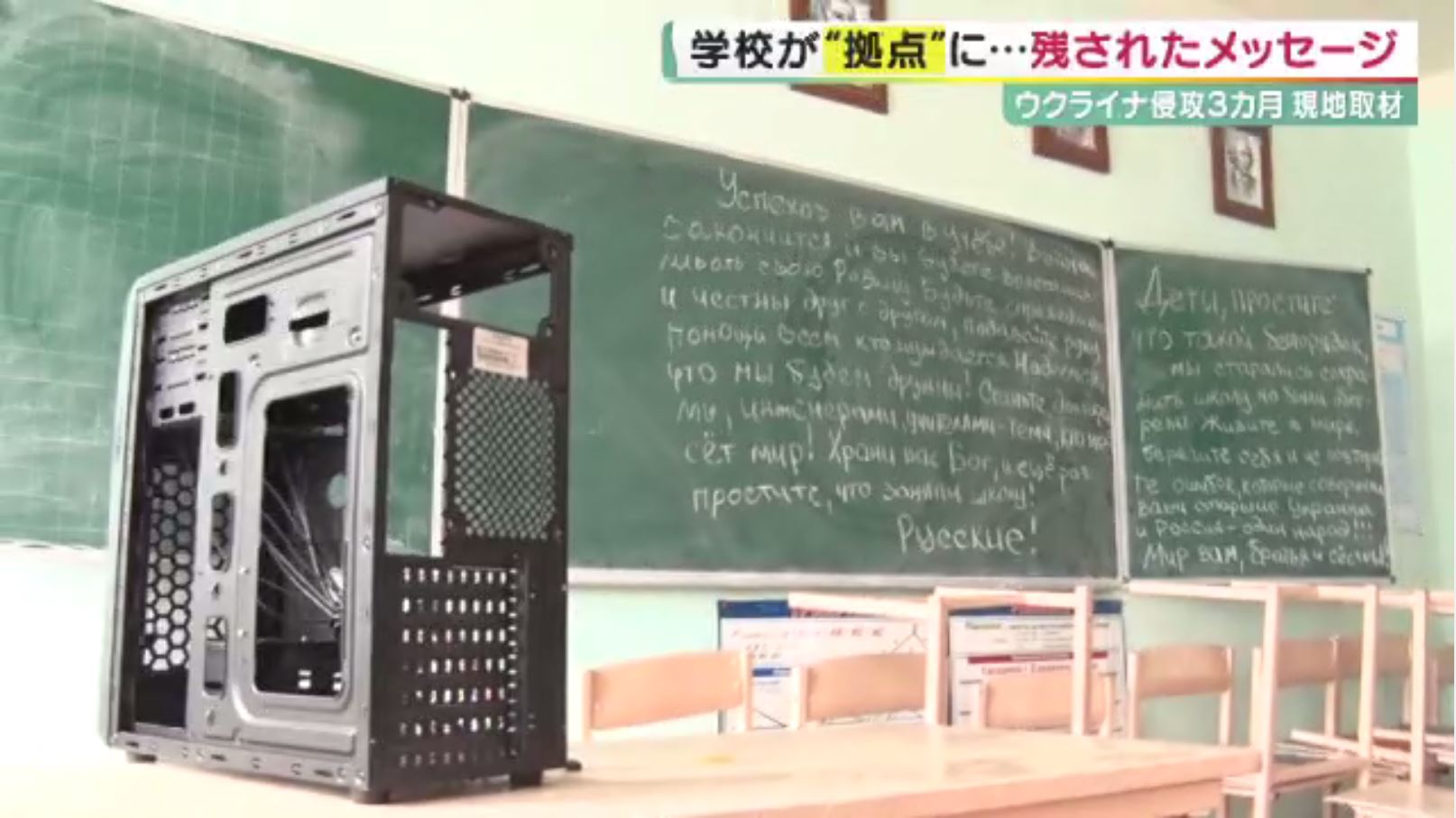 ロシア軍が村から撤退した後の黒板には「子供たち、こんなに混乱させてごめんなさい」と書かれていました。