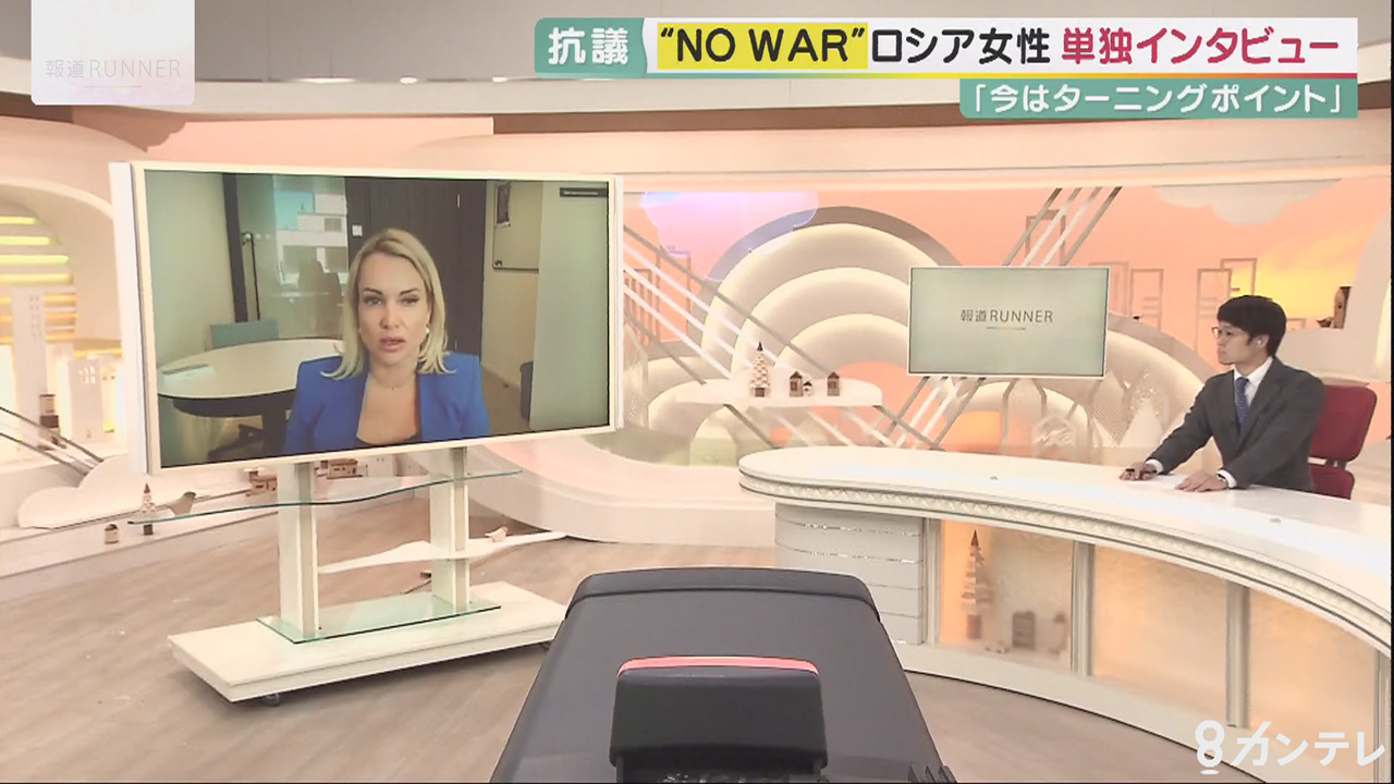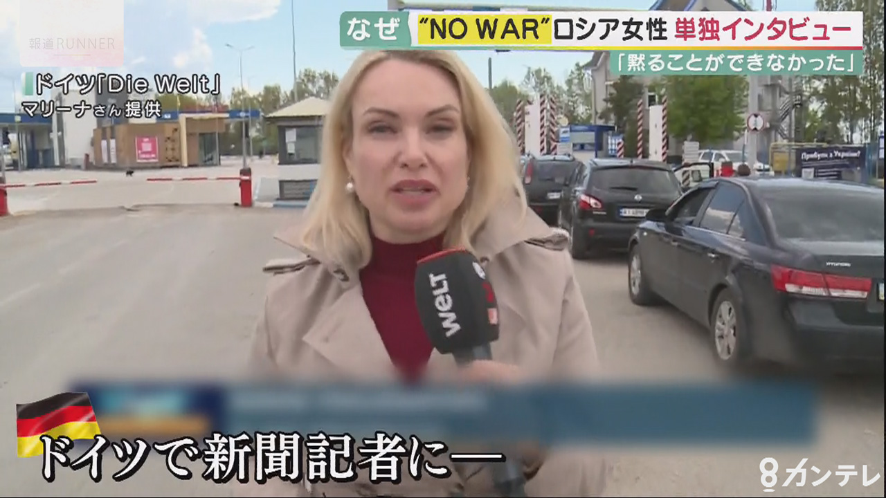 今年3月、ロシアの国営テレビの生放送中、突如、キャスターの背後に乱入し「反戦」を訴えた女性。マリーナ・オフシャンニコワさん(43)。