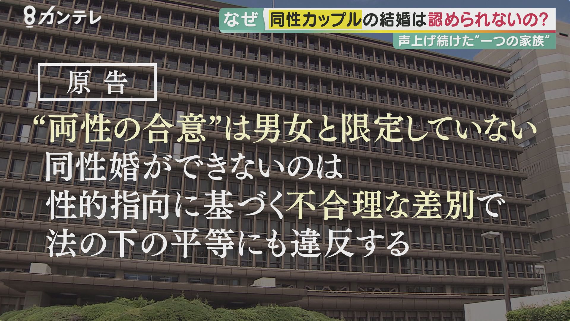 裁判で、原告側は、「”両性の合意”は男女と限定していない。同性婚ができないのは、性的指向に基づく不合理な差別で、法の下の平等にも違反する」と主張しました。