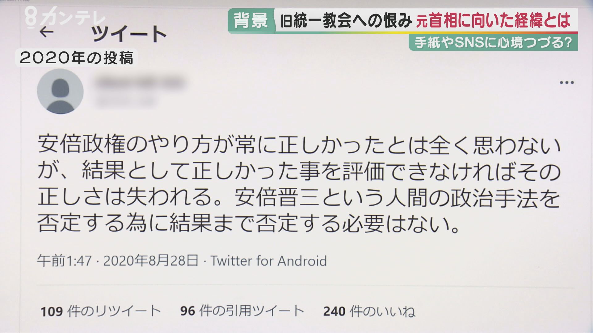 手紙に記した自身のものだというTwitterのアカウントにも旧統一教会への恨みが綴られる一方、安倍元総理に対して理解を示す投稿もあり、殺害に至るまでの複雑な心境が垣間見えます。