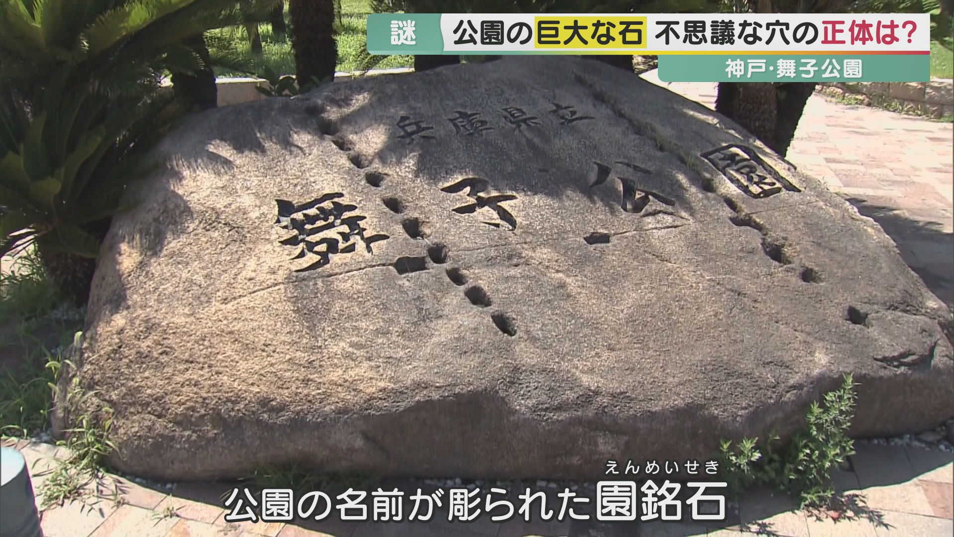 大阪城などにある歴史的価値のある石を研究する高田さんによると、不思議な穴の正体は石を切り出しやすくするため楔(くさび)を打ち込んだときにできる「矢穴」と呼ばれるもので、園銘石は約400年前、江戸時代に行われた大阪城再建のための石垣の材料と分かりました。