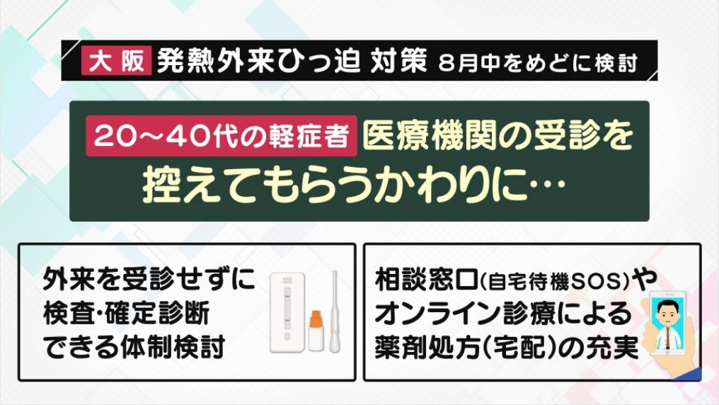 大阪府は、新たな取り組みとして、20代から40代の軽症者に医療機関の受診を控えてもらう代わりに、外来を受診せずに検査・確定診断ができる検査体制を検討していくということです。
