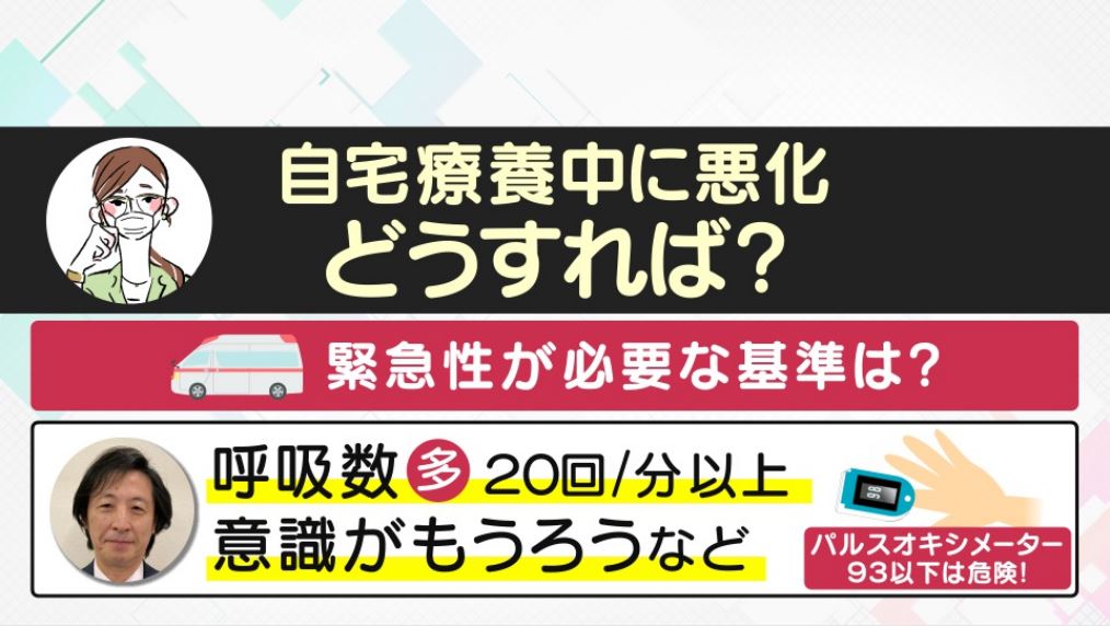 A:「1分間で20回以上の呼吸」「パルスオキシメーター(酸素飽和度を測る機械)で93以下の数値」「意識がもうろうとしている」など