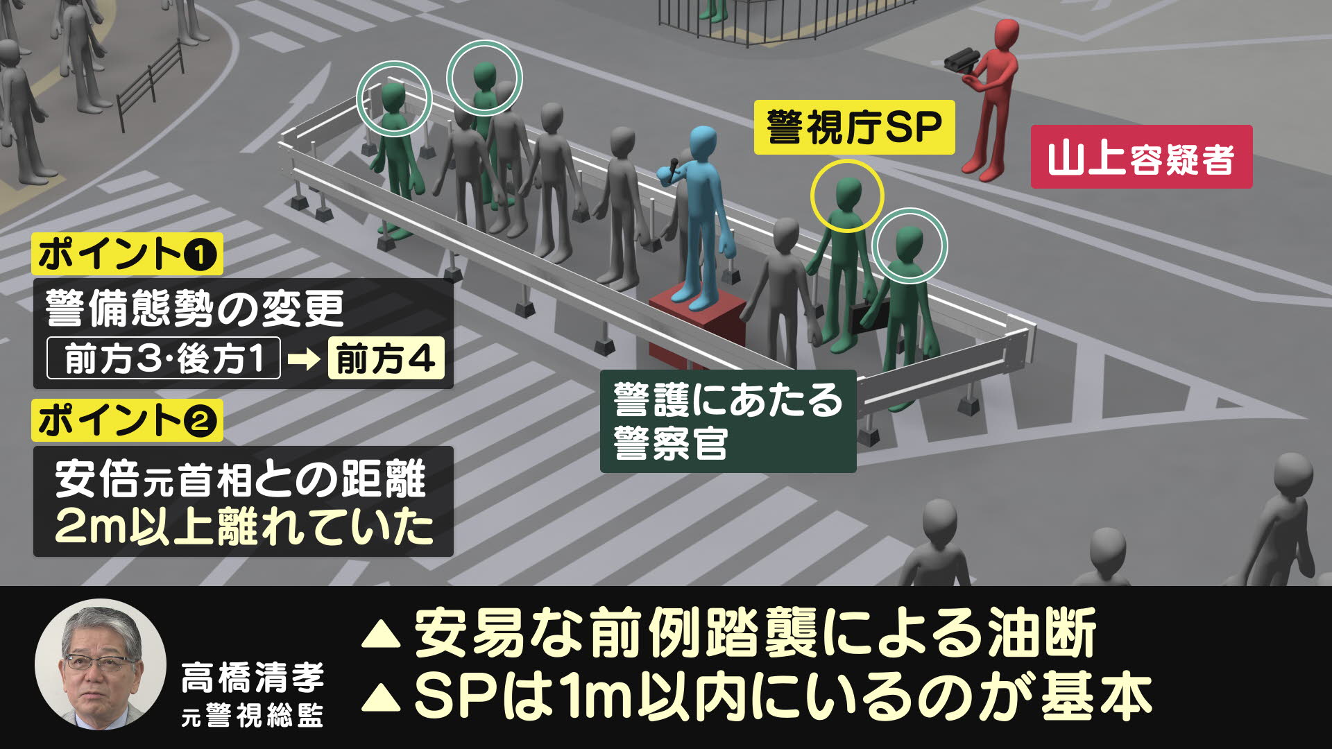 これらについて、高橋元警視総監は「これまで警護がうまくいってしまっていたから、安易に前例を踏襲して油断があったのではないか」と話します。