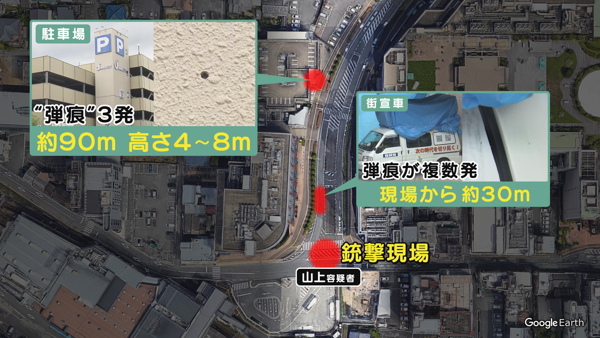 今回の事件では、銃弾が現場から90メートル離れた駐車場の壁に当たっていました。