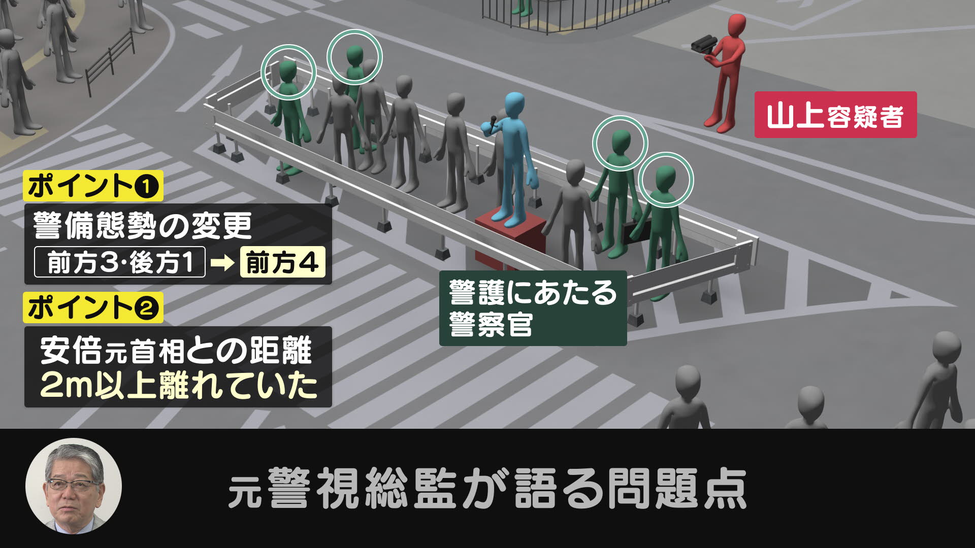 しかしその1人も、演説の直前にガードレールの中に入り、主な警戒方向を聴衆が多くいる前方に変更していたことが分かりました。