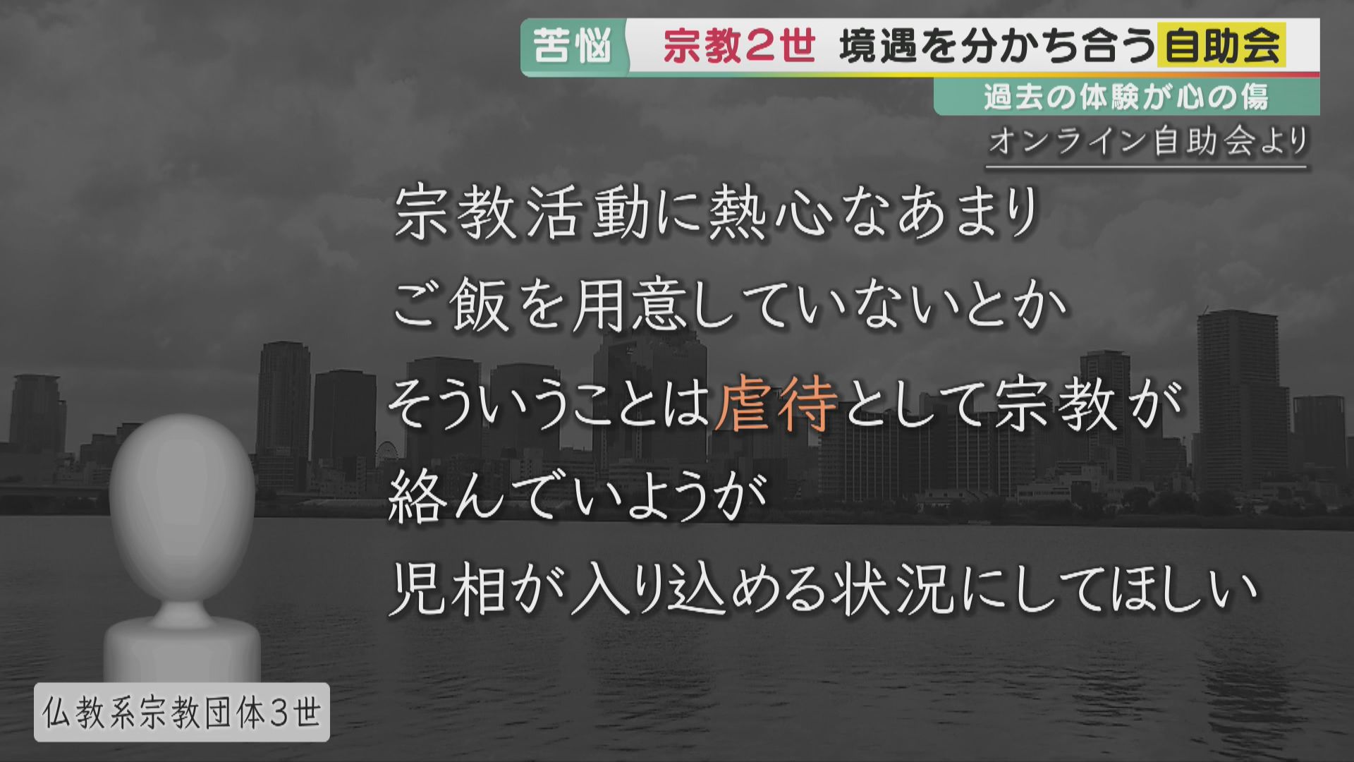 宗教2世の人たちは、宗教と縁を切り時間がたったあとも過去の体験が傷となって残り、生活にも影響が出ています。この日の自助会では同じような存在を少しでも減らしたいと、2世の支援について考える場面もありました。