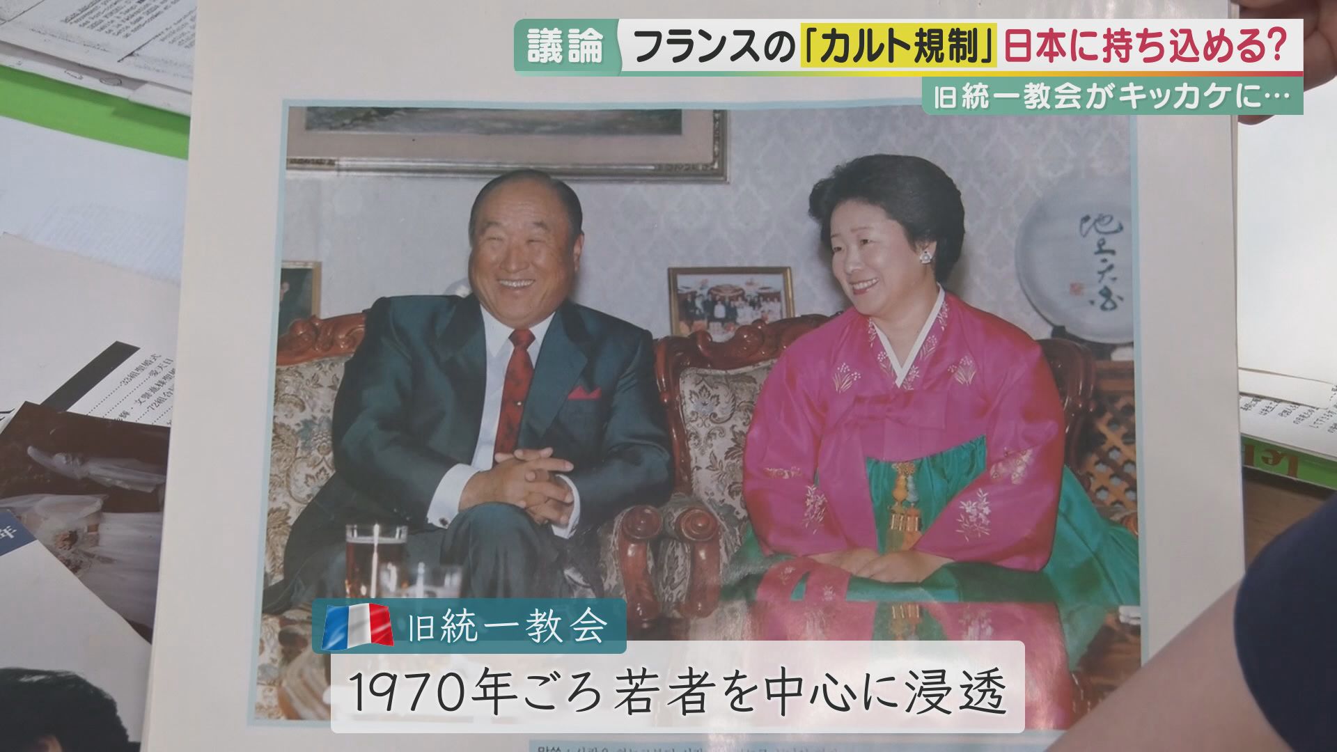 事務所の棚にあったのは、旧統一教会に関する資料。日本語で書かれたパンフレットや、創始者・文鮮明(ムン・ソンミョン)氏を表す「MOON」の文字が。フランスで旧統一教会は、学生運動が盛んだった1970年頃、若者を中心に浸透していったといいます。
