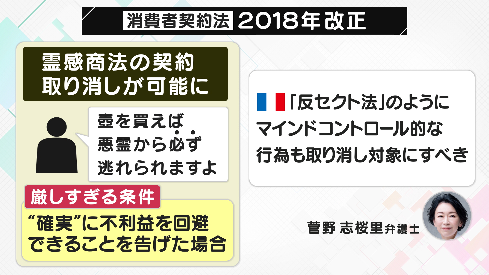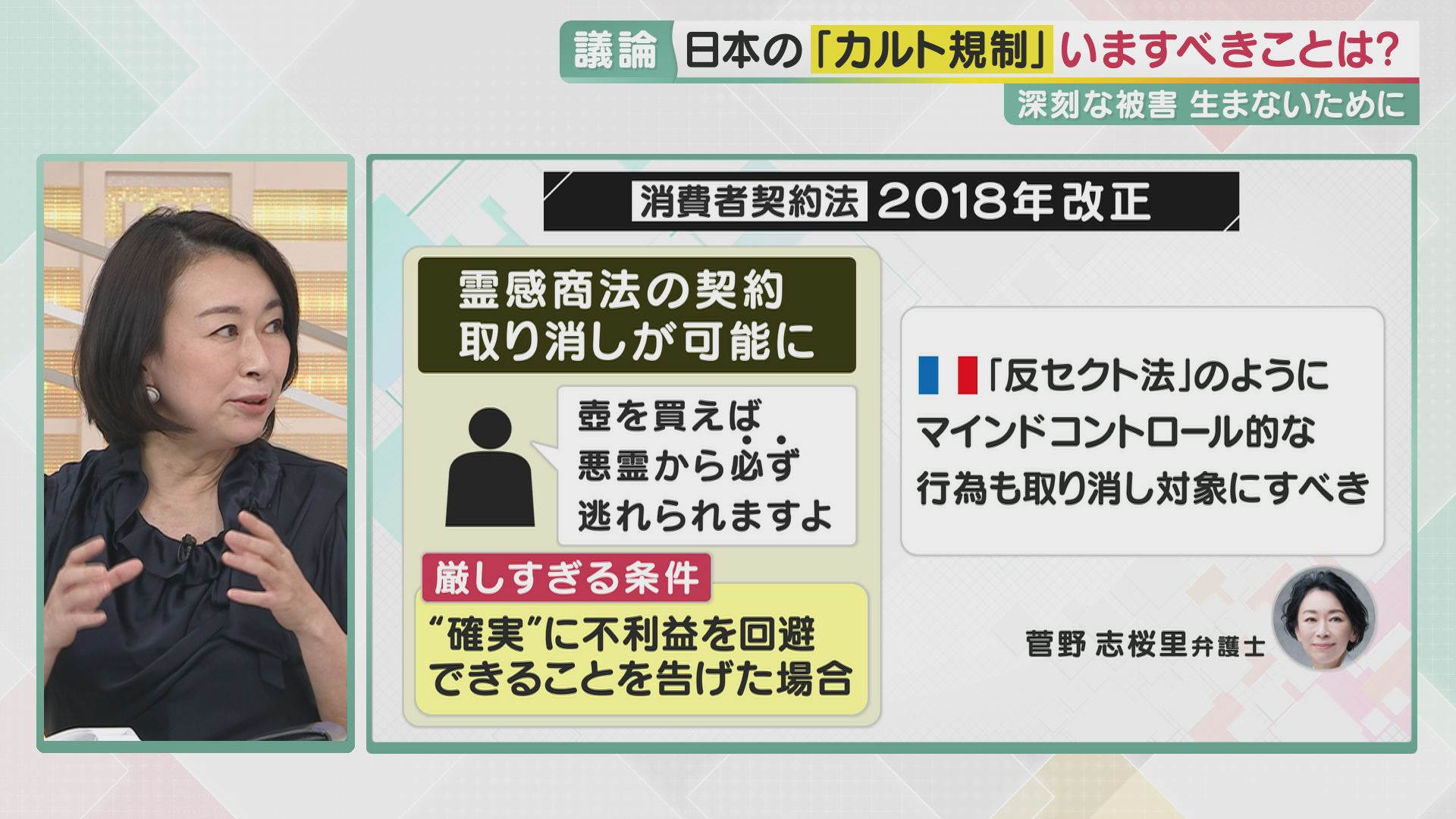 ――Q:ただ、そのまま一気に「解散命令」まで出すのは行き過ぎ、というのが菅野弁護士のご意見ですね。既存の法律やルールを変更ということで、具体的に「消費者契約法」の改正を挙げられています。2018年の消費者契約法改正で霊感商法の取り消しが可能になりましたが、「壺を買えば悪霊から“必ず”逃れられますよ」というような、“確実に不利益が回避できる”といったことを告げた場合に限られるんですね。菅野弁護士はこれに対して、「反セクト法のようにマインドコントロール的な行為も取り消し対象にすべき」ということですが…
