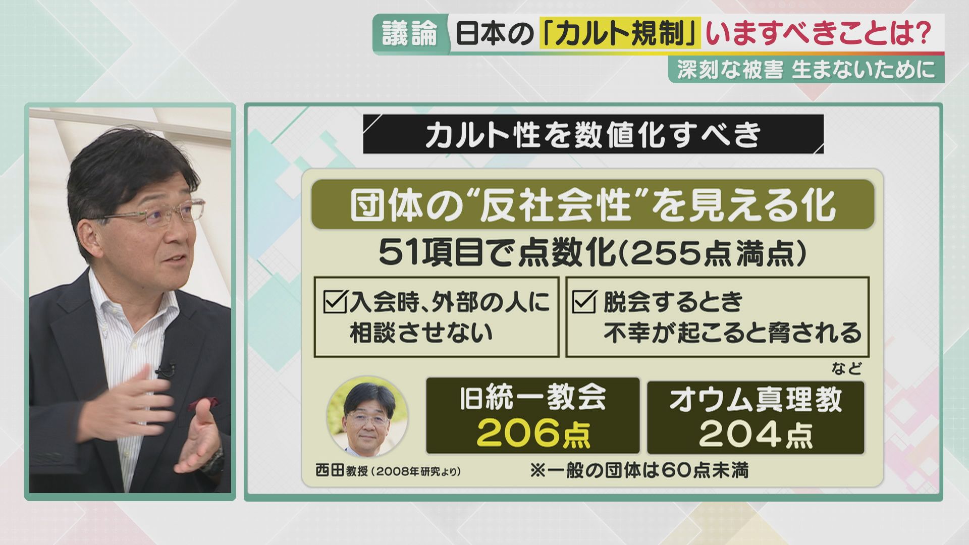 ――Q:西田さんは「宗教団体などのカルト性を目安として数値化すべき」としています。過去に「団体の“反社会性”を見える化」するという研究をされていました。「入会時、外部の人に相談させない」や「脱会するとき『不幸が起こる』と脅される」など、独自に51の項目の基準を作ってチェックする。255点満点で、旧統一教会は206点と、オウム真理教の204点と並ぶ高さだったそうですね。一般の宗教は60点未満なんで大きな差がついていたということですが、この基準でカルト性を浮かび上がらせることができるということですか?