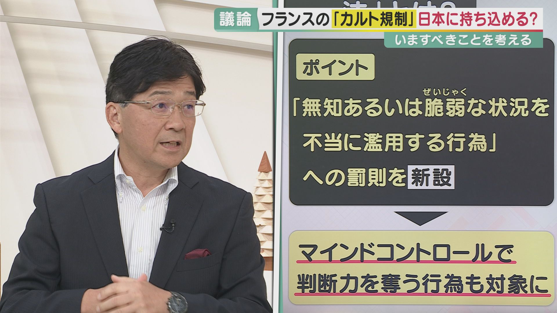 「反セクト法では、“こういう行為をやるとこういう罰があります”の“こういう行為”の一部に、“無知あるいは脆弱な状況を乱用して害を与える”ということを入れています。ここは日本の法律にも入れられると思います。フランスもこれだけを処罰の対象にしているのではなく、だますこと、いかさま医療、押し売りなどさまざまな項目があるんですけど、マインドコントロールされている人は、だまされている、押しつけられているとは思わない。そこをすくい取るバスケット的な要件として、“無知あるいは脆弱な状況を乱用して害を与えてはいけない”と。ここは日本でも十分入れられると思います」