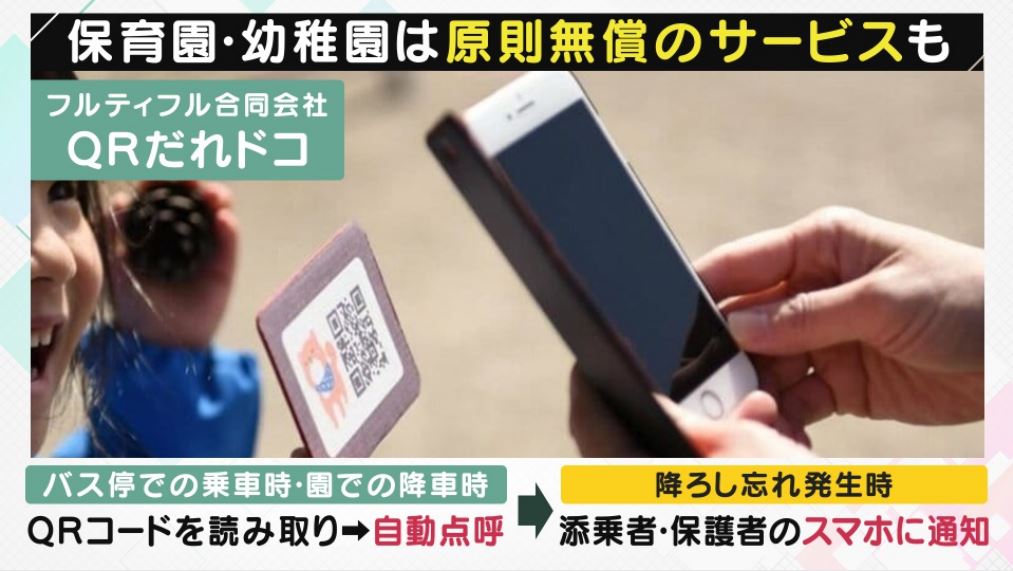 フルティフル合同会社が開発したアプリ「QRだれドコ」。バス停での乗車時と園での下車時に、名札の裏などに付けたQRコードを読み取ることで自動点呼するというシステムで、もし降ろし忘れが発生したときは、添乗者や保護者のスマホに通知が来ます。保育園・幼稚園には原則無償で提供されます。