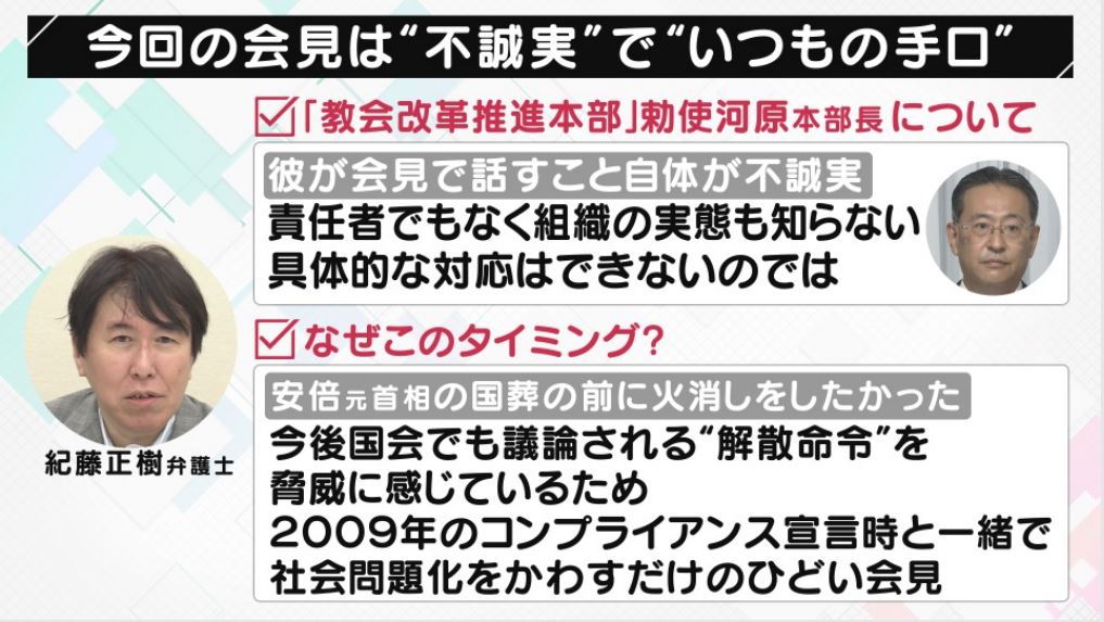 「不誠実」「いつもの手口」 旧統一教会の3度目の会見を紀藤弁護士が一刀両断 「社会問題化をかわすだけのひどい会見」