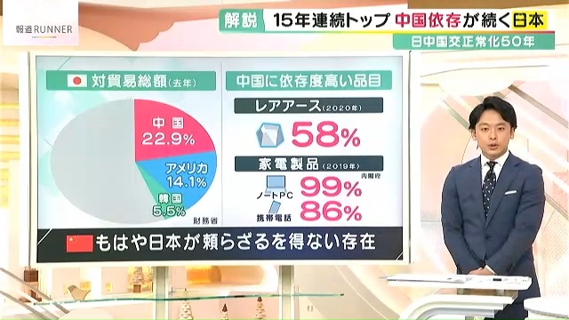 この50年で立場が逆転した日中関係ですが、日本が中国に経済面で依存しているという事実もあります。日本の対貿易総額(2021年)は、中国が2割以上を占め、アメリカを大きく上回っています。また、電子機器を作る際に欠かせない鉱物資源「レアアース」は約6割を中国に依存していて、輸入家電ではノートパソコンや携帯電話の多くが中国からのものになります。