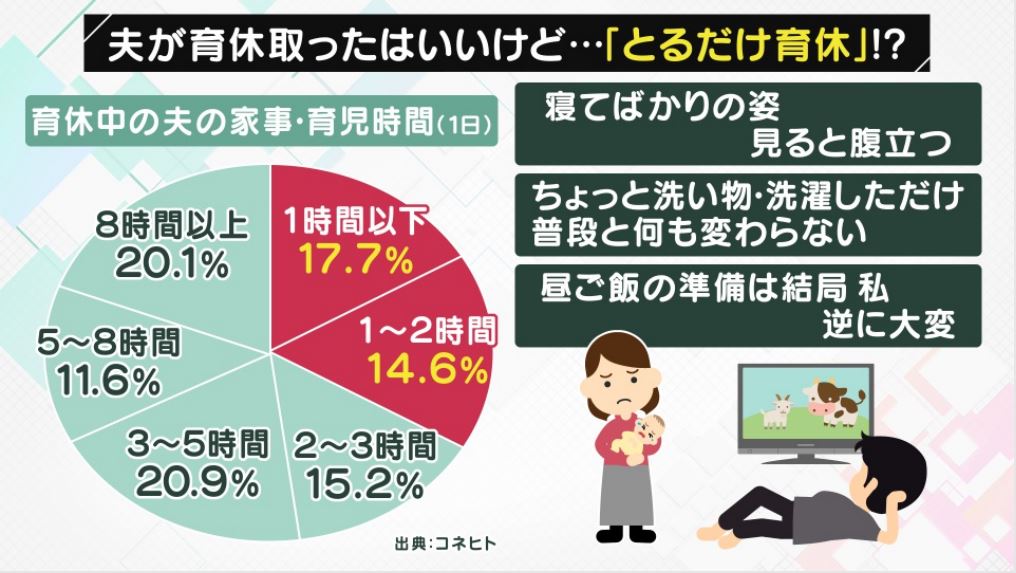 また、せっかく育休を取得しても、実際は妻に家事・育児を任せきりで何もしない「とるだけ育休」という言葉もあります。夫が育休を取得した女性500人を対象に行われたアンケート調査では、「育休中の夫の家事・育児時間(1日)」が2時間以下と答えた人が30パーセント以上に上り、SNSにも育休中の夫への不満が多数書き込まれています。