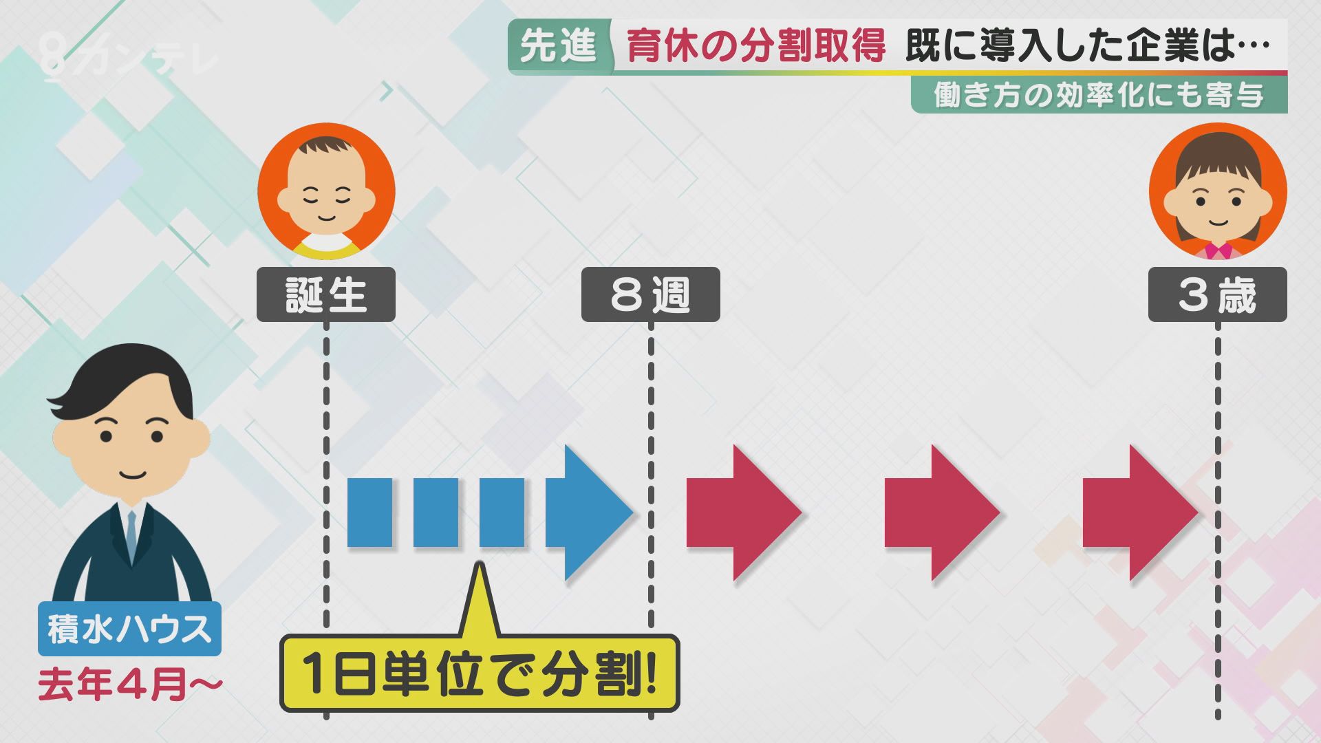 この育休を分割できるシステムを先駆けて導入した企業が、大阪の住宅メーカー「積水ハウス」。産後8週までの育休をさらに1日単位で細かく取得できるという、国の一歩先まで進んだ制度です。