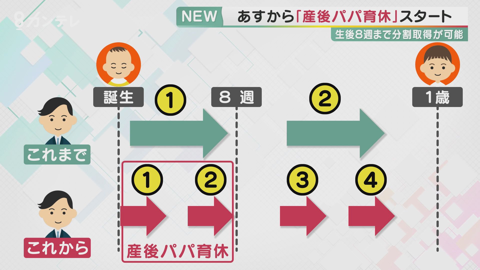 働くお父さんが「取りにくい」というこれまでの育休。10月から「産後パパ育休」という制度が始まり、「育休」とは別に生後8週まで、2回に分けて取れるようになります。これにより、これまでは原則1歳までに最大で2回の育休が認められていたところ、それぞれを2分割、最大で4回に分けて取得できるようになります。