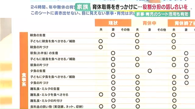 この課題に対応するため、積水ハウスが作成しているのが「家族ミーティングシート」。育児・家事などを細かく項目立てて見える化することで、「現状」「育休中」「育休後」に誰がどの担務を担うべきかを話し合うことができます。積水ハウスのHPに掲載されていて、ダウンロードして誰でも使うことができます。