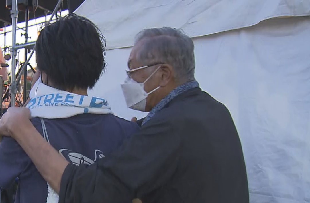 舞台袖で泣く中川さんの肩を和田会長が抱きました。最初は一番怖かった商店会の和田会長が、いまは一番の理解者です。
